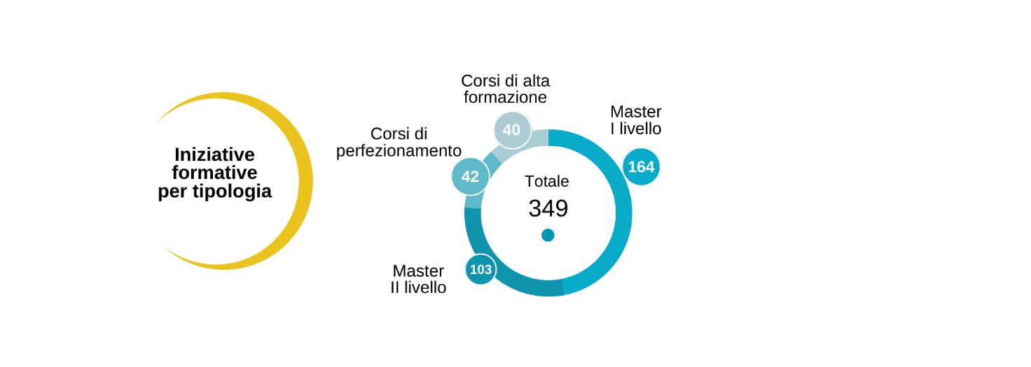 La massima concentrazione dei master sia di primo che di secondo livello si realizza nella macroarea scientifico-ambientale e, per quanto concerne in particolare i master di primo livello, anche in quella economica. Il maggior numero di corsi di perfezionamento si registra nella macroarea scientifica, e a seguire in quella umanistico-sociale, pur se con valori assoluti esattamente dimezzati, mentre i corsi di alta formazione si ripartiscono sostanzialmente in modo uguale tra scientifico-ambientale, giuridica e umanistico-sociale, con un picco nella macroarea economica. Il primato numerico delle iniziative formative scientifiche attivate si registra in numerose facoltà e dipartimenti universitari, con ingegneria in primo piano.