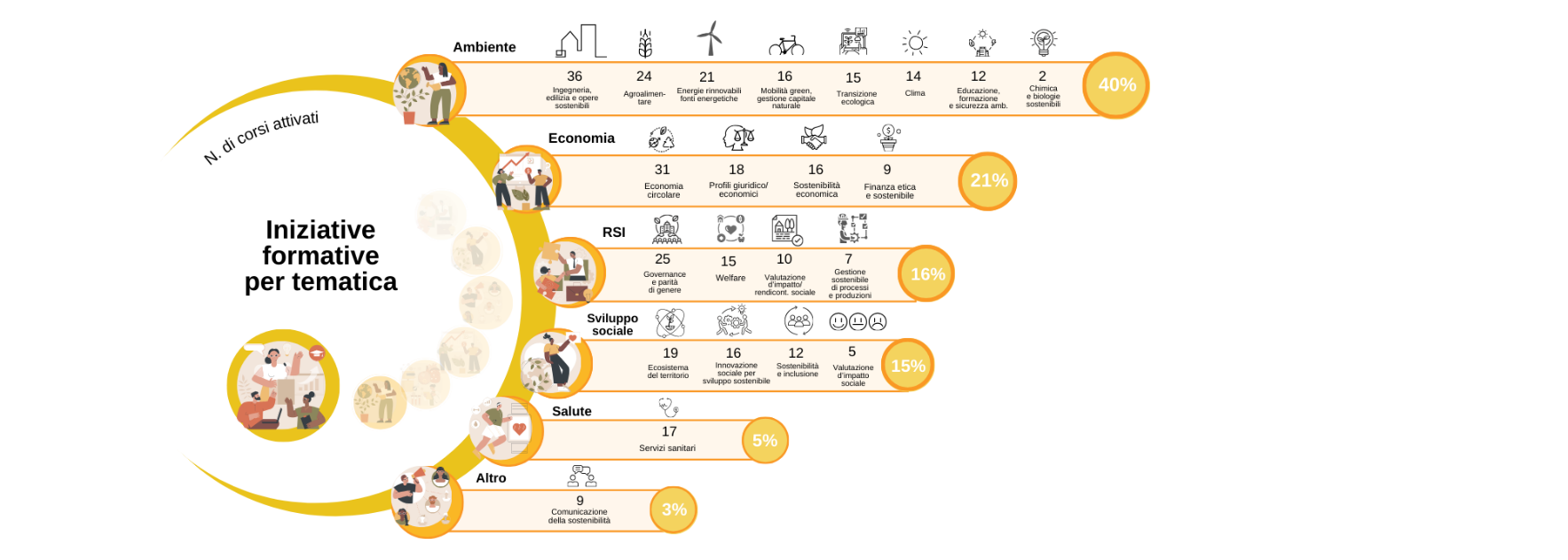 Dalle macroaree si scende poi nel dettaglio delle specifiche tematiche nelle quali si declinano gli interventi. La sostenibilità ambientale è preponderante, con 140 iniziative formative pari al 40% del totale e si diversifica dall’agroalimentare alla mobilità green e gestione del capitale naturale, dalle energie rinnovabili alla sostenibilità climatica, dalla transizione ecologica alla formazione ambientale, ma l’ambito più attivato riguarda l’ingegneria, l’edilizia e le opere sostenibili. La sostenibilità economica rappresenta il 21%, con una netta prevalenza di corsi sull’economia circolare, mentre la sostenibilità per lo sviluppo sociale il 15% e la responsabilità sociale d’impresa il 16%, con una particolare attenzione ai modelli di governance e ai sistemi di welfare.