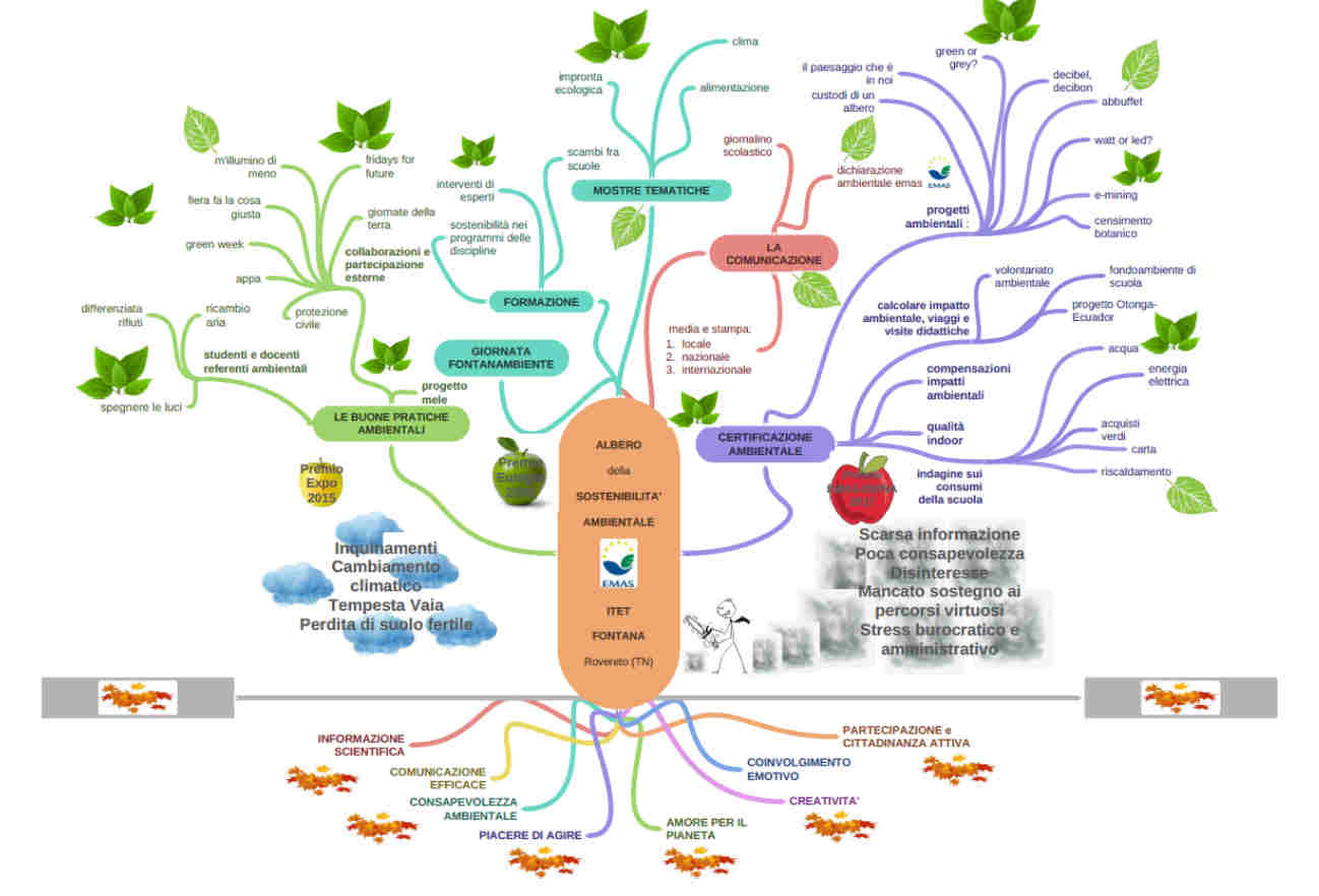La linfa che proviene dalle radici poi nutre le diverse azioni rappresentate dalle ramificazioni. Il ramo delle buone pratiche ambientali curate dai referenti ambientali di scuola e dalle collaborazioni esterne; il ramo della formazione con le mostre tematiche e la giornata ambientale; il ramo della comunicazione con la importante dichiarazione Emas ed il giornalino scolastico, quello della certificazione ambientale diversificata nei vari progetti, nei monitoraggi ambientali nell’istituto scolastico e la loro compensazione nel sud del mondo.