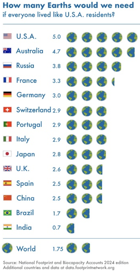 Secondo il Gfn, per soddisfare l’intera e attuale domanda mondiale di risorse servirebbero 1,75 Terre. Un dato medio basato sia sugli stili di vita delle nazioni ricche, sia su quelle che ancora devono sperimentare gli effetti della crescita economica. Dall’analisi si evince che molte nazioni povere risultano avere un consumo di risorse nei limiti di sostenibilità, le nazioni ricche sforano invece di gran lunga il budget a disposizione. Sulla base dell’impronta ecologica sono gli Stati Uniti a essere la nazione meno sostenibile al mondo: se tutti volessimo vivere come la nazione a stelle e strisce servirebbero addirittura cinque Pianeti. Al secondo posto della classifica dei Paesi con la peggiore impronta ecologica spicca l’Australia con 4,7 Terre, seguita dalla Russia (3,8), dalla Francia (3,3) e dalla Germania (3,0). L’Italia, seppur lontana dai consumi d’oltreoceano, rimane in una condizione di forte insostenibilità: è ottava in classifica con uno stile di vita che, se fosse attuato dall’intera popolazione mondiale, richiederebbe 2,9 Pianeti per sostenersi.