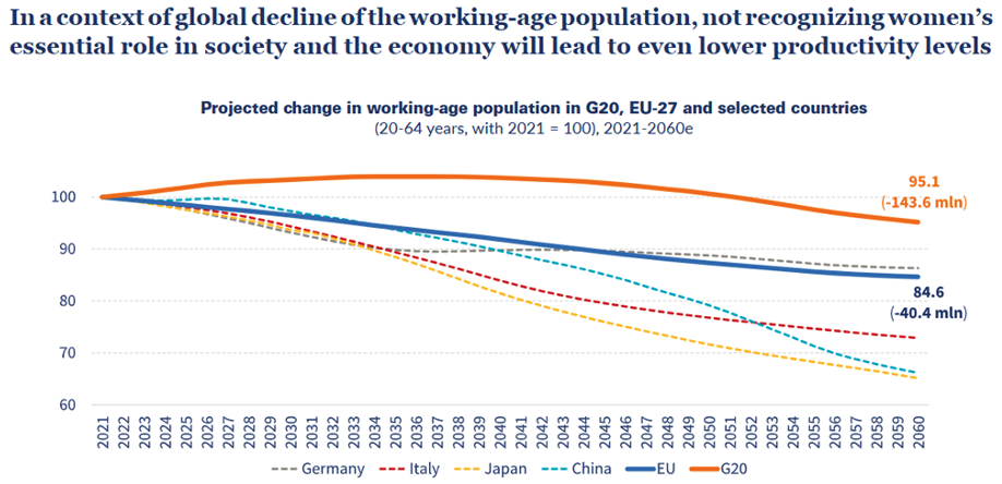 Promuovere l’empowerment femminile nel contesto lavorativo è una questione cruciale per i diritti sociali, ma non solo: si tratta anche di una importante opportunità di crescita economica che vale fino a 11,1 mila miliardi di dollari (12% del Pil del G20), secondo lo studio Ambrosetti. In un contesto di declino globale della popolazione in età lavorativa, il mancato riconoscimento del ruolo essenziale delle donne nella società e nell’economia porterà a livelli di produttività ancora più bassi (si vedano le previsioni al 2060 del grafico sotto). Invece, come abbiamo già ribadito recentemente attraverso un’intervista su La Stampa al direttore scientifico dell’ASviS Enrico Giovannini, poiché l’Italia ha una procedura di deficit eccessivo, il governo dovrebbe presentare alla Commissione europea un piano accompagnato da investimenti e riforme che aumentino il tasso di crescita potenziale del Pil per avere una dilazione di tre anni sul piano di rientro, puntando soprattutto su giovani e donne: “L'Italia non ha un piano per l'occupazione giovanile e delle donne degno di questo nome. Nei prossimi 7 anni andrebbero messi in campo ambe due per alzare la crescita potenziale”.