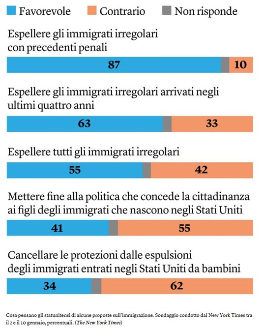 Ma il mondo sembra andare in un’altra direzione. Secondo un sondaggio del New York Times, oggi l’opinione pubblica statunitense è più allineata con i programmi di espatrio del tycoon. Il 55% dei cittadini statunitensi è favorevole all’espulsione degli immigrati senza documenti (circa 13-14 milioni di persone), il 54% all’espulsione delle persone entrate illegalmente negli Usa dal 2020, il 41% è d’accordo con quest’affermazione: “Gli immigrati oggi sono un peso per il nostro Paese”.