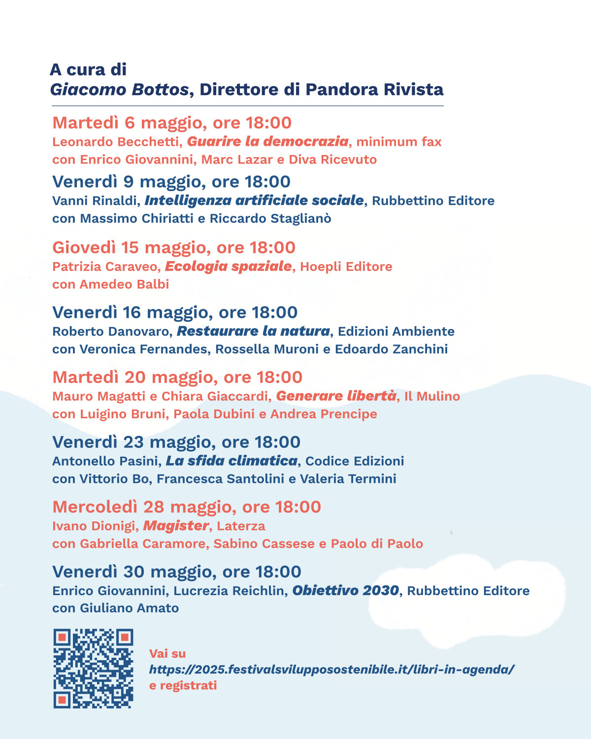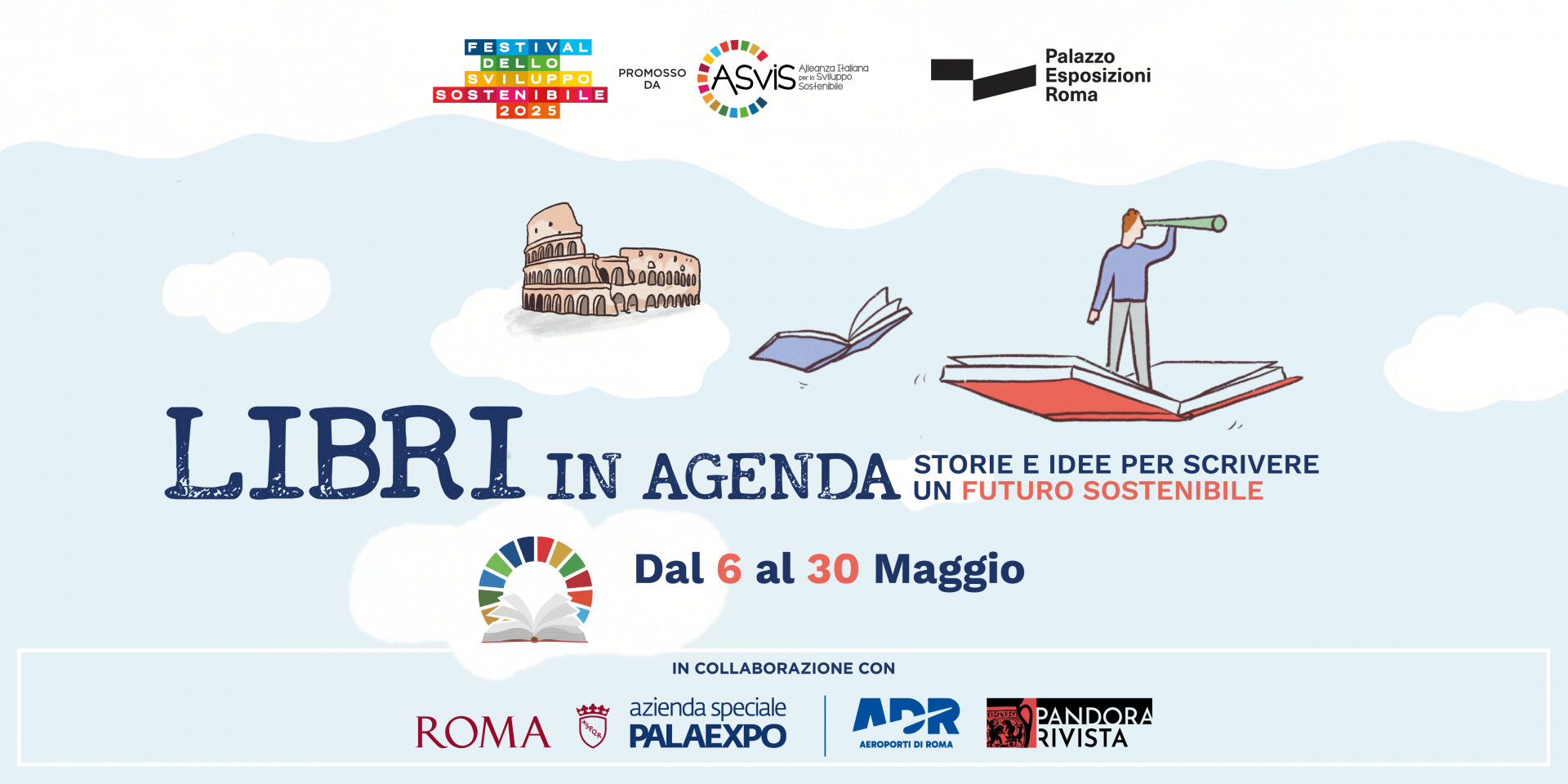 Nell'ambito del Festival, dal 6 al 30 maggio, si terrà per la prima volta anche "Libri in Agenda”, una rassegna di otto incontri dedicati alla presentazione di libri che affrontano i temi chiave dello sviluppo sostenibile. Attraverso il dialogo con autrici e autori, esperte ed esperti, ogni appuntamento sarà l’occasione per stimolare un dibattito e approfondire aspetti specifici della sostenibilità, dall’economia circolare alla giustizia sociale, dall’innovazione tecnologica al funzionamento dei sistemi politici, dalle frontiere della scienza alla politica internazionale. L'iniziativa a cura di Giacomo Bottos, direttore di Pandora Rivista, è realizzata in collaborazione con l'Azienda Speciale Palaexpo, che ospiterà gli incontri al Palazzo delle Esposizioni di Roma. Gli appuntamenti si terranno sempre alle 18.00, mettili in agenda!