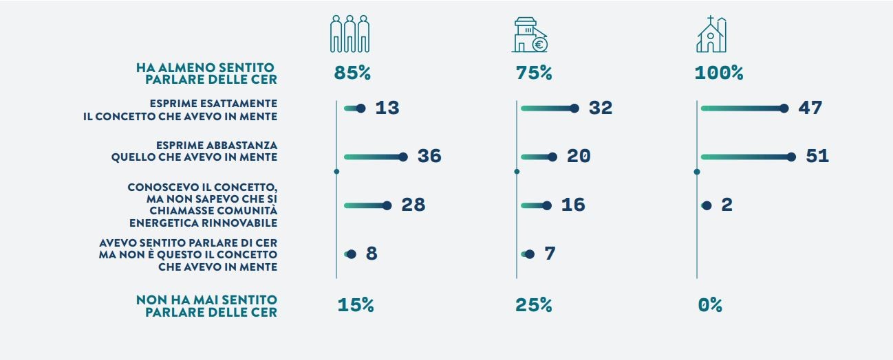 Il Rapporto ha rilevato che le Comunità energetiche rappresentano “un fenomeno in crescita nel nostro Paese”, sia a livello di conoscenza diffusa sul territorio che di investimenti e progetti. Secondo il documento, tre imprese su quattro (75%) e una persona su sei (15%) hanno sentito parlare di Comunità energetiche; tuttavia, è solo il 13% dei cittadini e delle cittadine a conoscere bene il concetto di Cer, il 32% delle imprese, ma ben il 47% dei referenti diocesani.