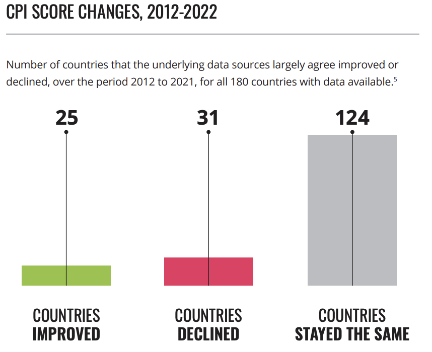 L’Italia sta crescendo nella lotta alla corruzione, ma non abbastanza. Questo è il messaggio che emerge dal nuovo rapporto 2022 pubblicato dall’ong Transparency international, il cui scopo è di misurare l’indice di percezione della corruzione in 180 Stati del mondo in base a una scala che va da 0 (alto livello di corruzione percepita) a 100 (basso livello di corruzione percepita). Il nostro Paese registra ormai da dieci anni un andamento positivo, che ha visto passare il suo punteggio da 42 punti nel 2012 a 56 nel 2022, con una differenza di 14 punti in più. È un risultato che mostra l’impegno italiano sul fronte della trasparenza e della corruzione, ma sottolinea anche la necessità di fare di più.