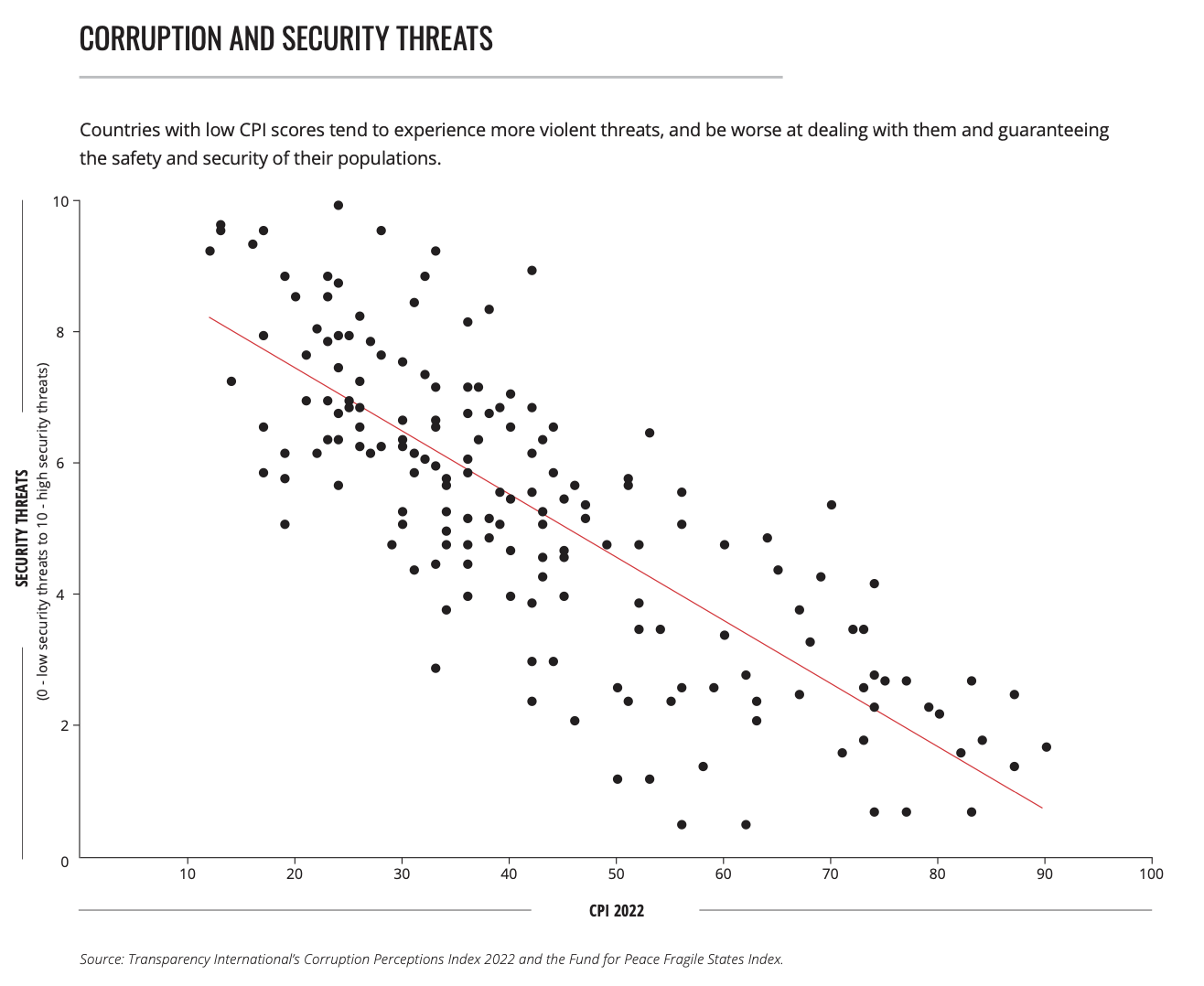 La corruzione, madre e figlia dei conflitti. Il fatto che la percezione della corruzione nel mondo sia un fenomeno che tende a mantenersi, se non a peggiorare, è un risultato e una conseguenza dell’inasprimento dei conflitti nel mondo, riporta il documento. In un mondo dove la pace è a rischio e dove le guerre aumentano negli anni, invece di diminuire, la corruzione trova terreno fertile: “l’instabilità politica, le crescenti pressioni sulle risorse pubbliche e l’indebolimento degli istituti di garanzia creano maggiori opportunità per crimini come peculato, appropriazione indebita e concussione”. Allo stesso tempo, nelle società dove non c’è un conflitto aperto, la persistenza di impunità e corruzione può portare a instabilità sociali, e di conseguenza a tensioni.