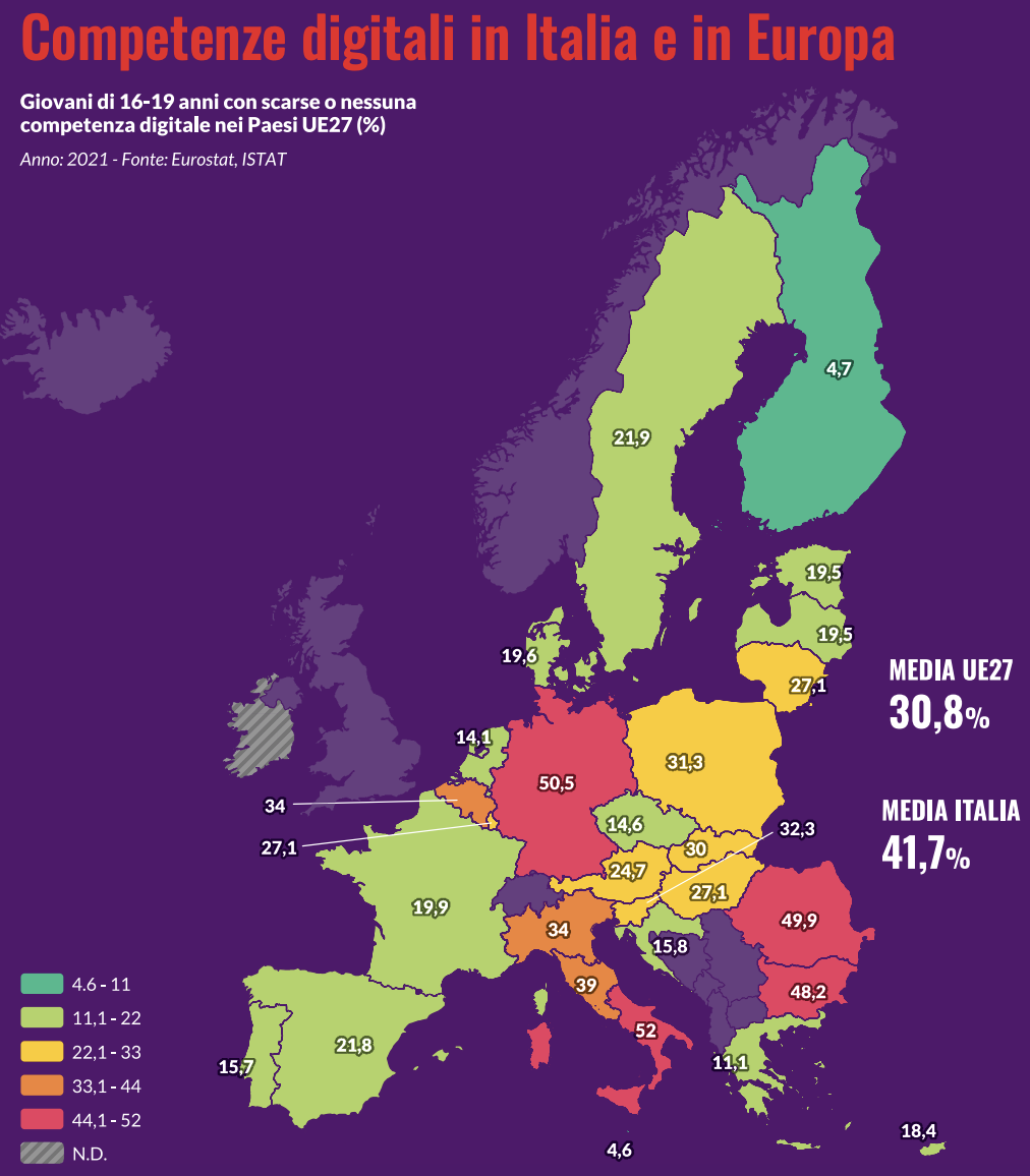 In Italia due giovani su cinque tra i 16 e i 19 anni hanno scarse o nessuna competenza digitale. Dalla tutela della privacy al cyerbullismo, l’Atlante dell’infanzia a rischio analizza l’impatto dell’innovazione sui giovani.  5/12/23