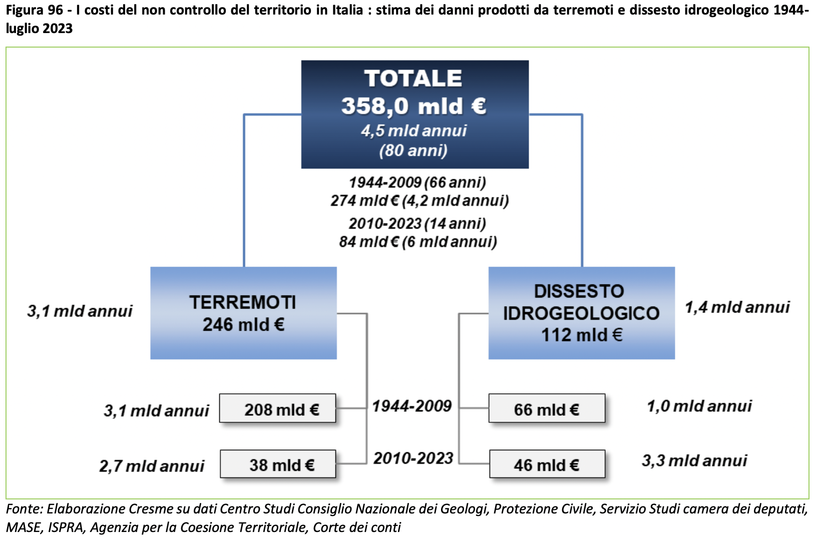 Dal 2010 a oggi la spesa per i danni da dissesto idrogeologico in Italia è triplicata raggiungendo 3,3 miliardi di euro l’anno. Inclusi i terremoti, più di 350 miliardi l’ammontare in 80 anni (valori 2023), con una media annua, tra il 1944 e il 2009, di 4,2 miliardi, salita a 6 miliardi tra il 2010 e il 2023.