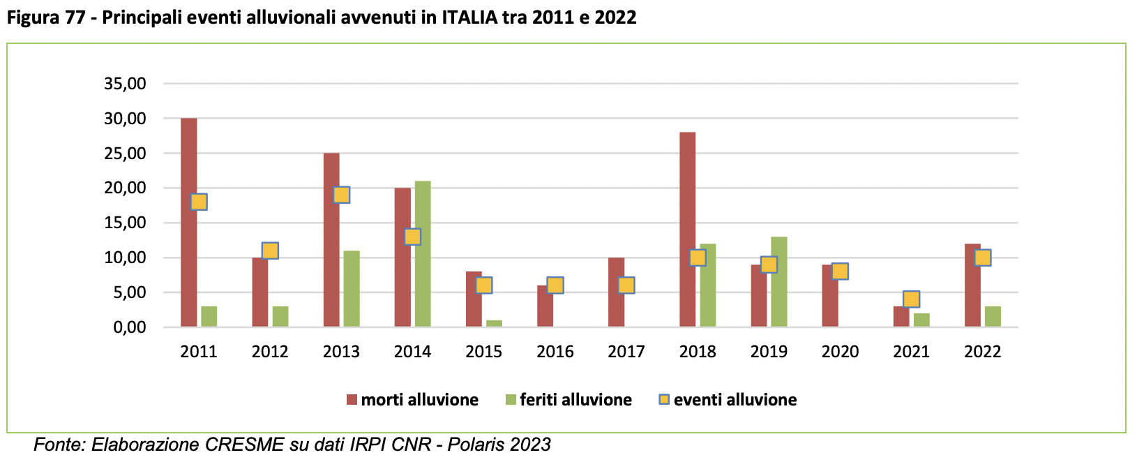 “In Italia negli ultimi 12 anni si sono verificati ben 120 eventi alluvionali”, si legge nel Rapporto, causando 170 vittime, circa 70 feriti e oltre 60mila evacuati. Considerando gli eventi di dissesto in termini di danni arrecati, tra gli anni peggiori si ricorda il 2014, quando si verificarono 13 eventi alluvionali che provocarono ingentissimi danni economici. Solo in Liguria, la Regione stimò per la parte pubblica circa 250 milioni di danni, 100 quelli stimati per le attività commerciali e produttive dalle associazioni di categoria.