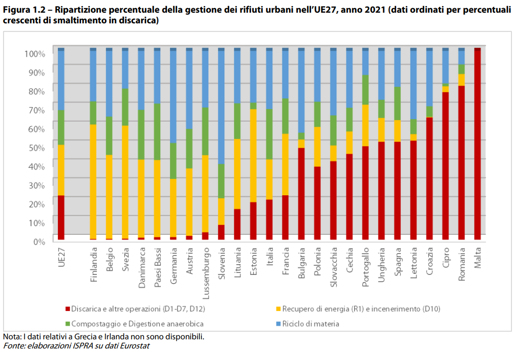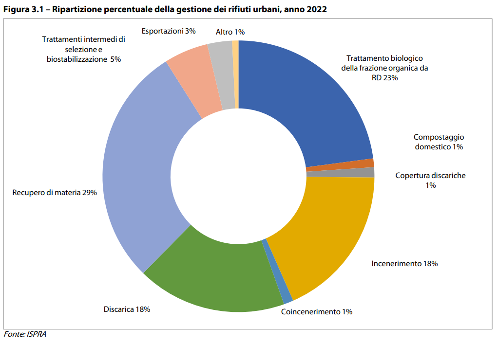 L'Italia avvia poco più del 30% dei rifiuti urbani trattati al riciclaggio e il 26% al compostaggio e alla digestione anaerobica (ovvero una degradazione organica per opera di microrganismi), con una quota totale di rifiuti avviati ad operazioni di riciclo di circa il 57%. Gli impianti di gestione dei rifiuti urbani, operativi nel 2022, sono 654, di cui oltre la metà dedicati al trattamento dell’organico. In discarica viene smaltito circa il 18% dei rifiuti totali, mentre un altro 18% viene destinato all’incenerimento.
