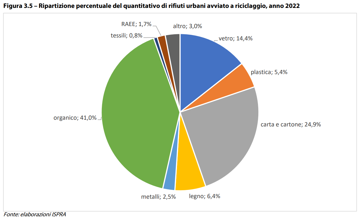 Tra i rifiuti differenziati, l’organico rappresenta la frazione più raccolta in Italia (il 38,3% del totale), costituita principalmente dall’umido di cucine e mense e da rifiuti biodegradabili provenienti dalla manutenzione di giardini e parchi. Seguono la carta e il cartone (19,3%), il vetro (12,3%) e, infine, la plastica (9%), costituita per il 95% da imballaggi. I materiali raccolti avviati poi al riciclaggio, nel 2022, sono stati principalmente la frazione organica (41%) e la carta e cartone, seguiti da vetro, legno, plastica e altri materiali, come si vede dall’immagine seguente.
