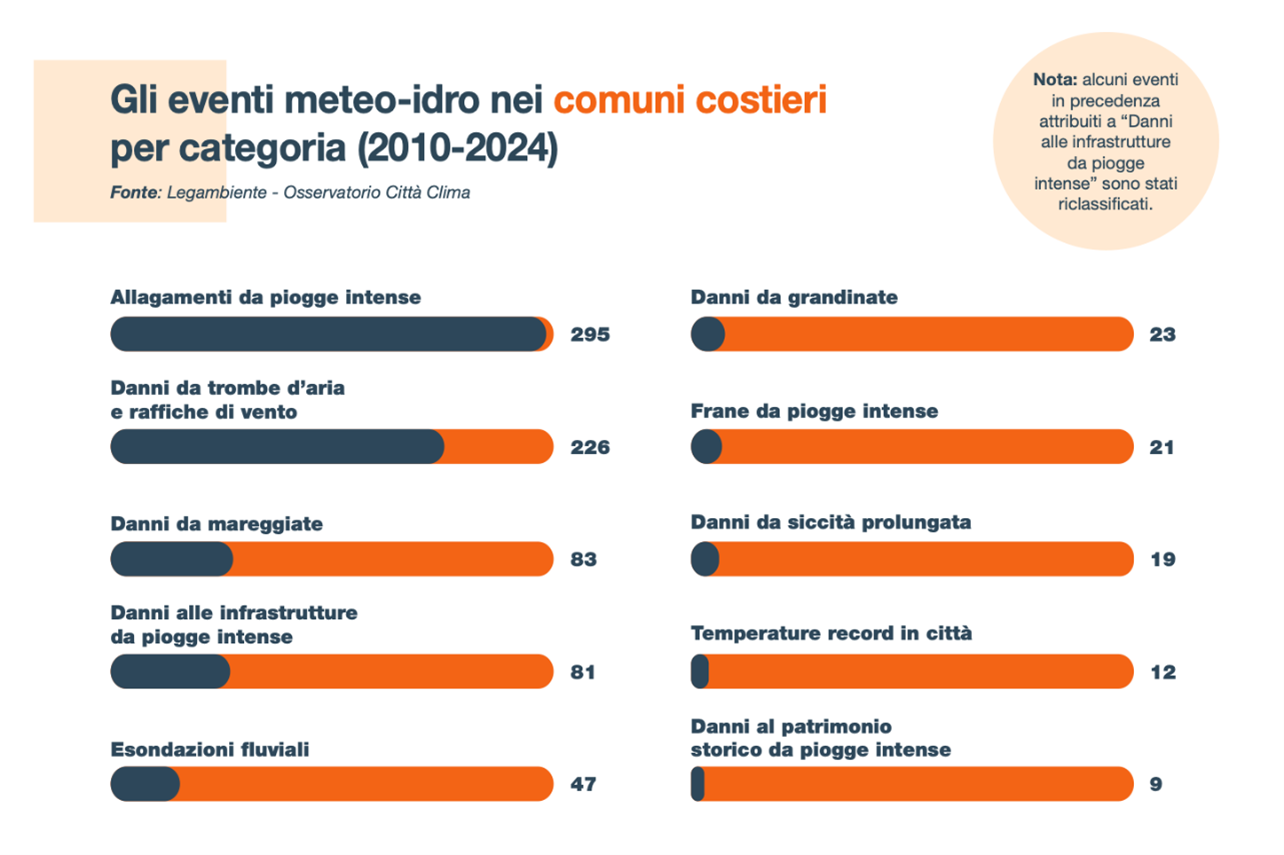 Gli eventi meteo estremi stanno colpendo sempre più frequentemente le aree costiere italiane, causando danni significativi e mettendo in evidenza la vulnerabilità di queste zone, in gran parte dovuta all'antropizzazione dei litorali e al cambiamento climatico, in particolare all'aumento della temperatura del Mediterraneo. Dal 2010 a giugno 2024, l'Osservatorio Città Clima di Legambiente ha rilevato un totale di oltre duemila eventi meteo estremi in Italia, di cui 816 (39,1%) nei comuni costieri. Legambiente, con il Rapporto Spiagge 2024, offre una fotografia impietosa dello stato delle zone costiere italiane, descrivendone i fattori di rischi a cui sono sottoposte e focalizzando l’attenzione sull'urgenza di affrontare il futuro con piani di adattamento e strumenti di governance che proteggano le persone, le abitazioni e le infrastrutture.