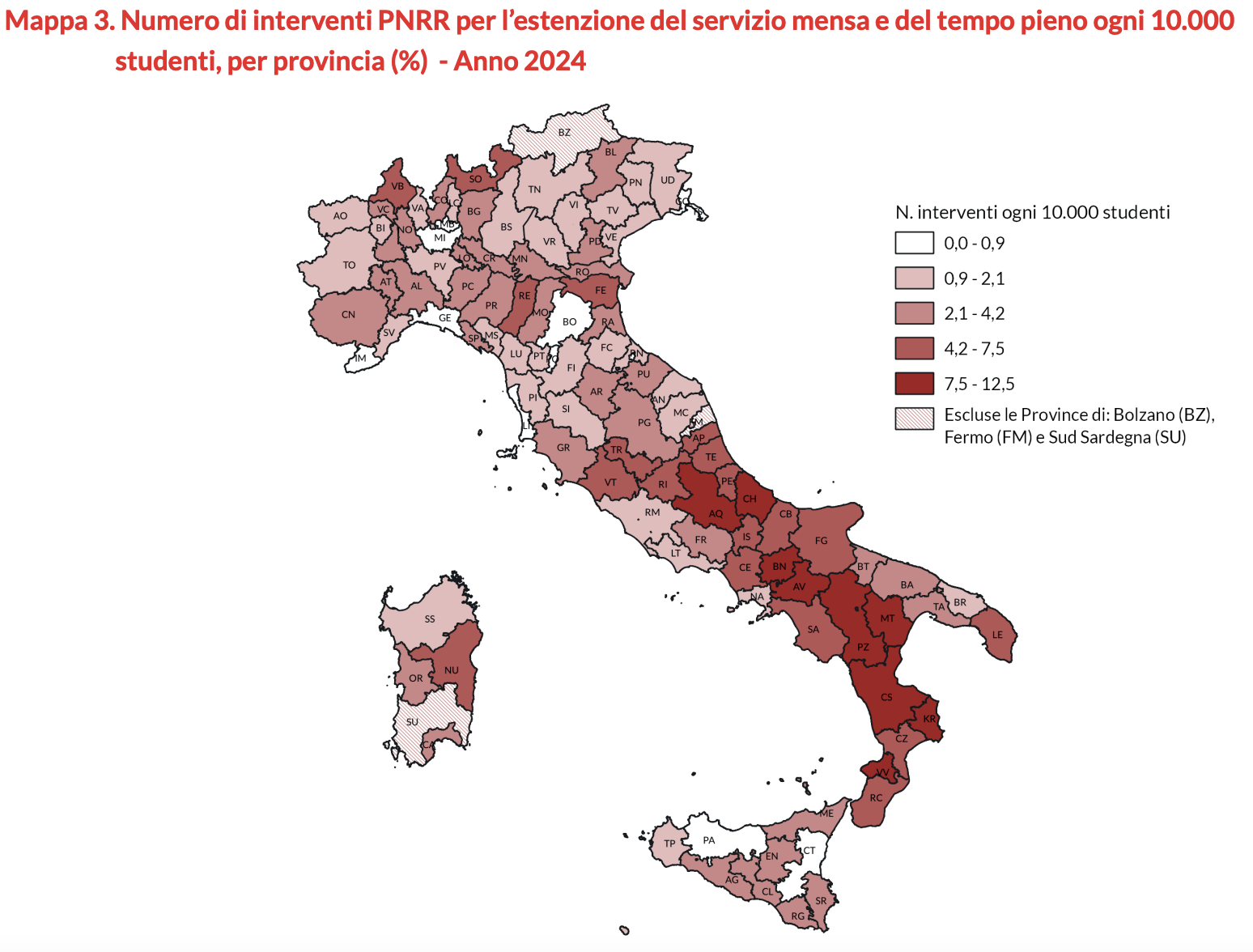 Le province del Sud, come Agrigento, Catania e Palermo, registrano infatti percentuali di copertura inferiori al 10%, mentre nel Nord, province come Biella e Monza superano il 70%. Le disuguaglianze territoriali nell'accesso alla mensa scolastica limitano l'alimentazione sana delle bambine e dei bambini e ostacolano l'implementazione del tempo pieno, disponibile solo per il 28,1% delle classi a livello nazionale, con una maggiore concentrazione nelle Regioni del Centro-Nord.