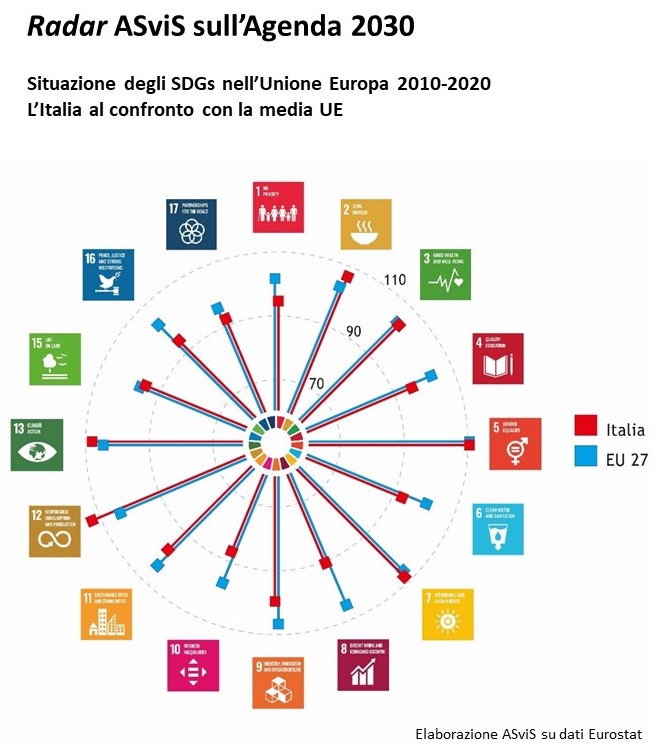Dallo studio risulta che nel 2020 (ultimo anno disponibile) l’Italia è al di sotto della media europea per nove Goal (Povertà, Educazione, Acqua pulita e servizi igienico sanitari, Condizione economica e occupazionale, Innovazione, Disuguaglianze, Città e comunità sostenibili, Governance e istituzioni e Cooperazione internazionale), allineata per cinque Goal (Salute e benessere, Parità di Genere, Sistema energetico, Cambiamenti climatici, Ecosistemi terrestri) e al di sopra perdue Goal (Alimentazione e agricoltura sostenibili, Modelli sostenibili di produzione e consumo). Non sono disponibili i dati sul Goal 14 relativo alle condizioni dei mari.