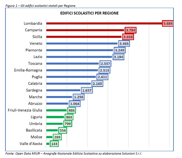 Lo stato dell’edilizia scolastica. Gli edifici scolastici italiani statali attivi nell’anno scolastico 2021-2022 sono 40.293, di cui il 33%  concentrato in tre regioni: Lombardia, Campania e Sicilia.