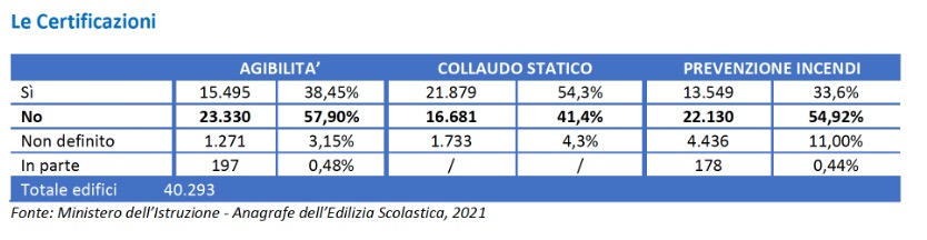 Di un quarto degli edifici non si conosce la data di costruzione, mentre è certo che il 42% di essi risale a prima del 1976. Il 58% è privo delle certificazioni di agibilità statica e il 55% di prevenzione incendi; oltre il 40% è privo del collaudo statico (ovvero dell’idoneità certificata dell’edificio). Il 77% delle scuole è in possesso del documento di valutazione rischi e il 79% ha redatto un Piano di emergenza.