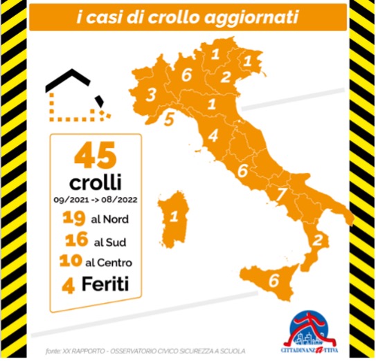 Emergenza crolli. Cittadinanzattiva riporta la testimonianza di 45 crolli tra settembre 2021 e agosto 2022, di cui 16 nelle regioni del Sud e nelle Isole (Campania, Calabria, Sicilia, Sardegna), 19 nel Nord (Lombardia, Piemonte, Liguria, Trentino-Alto Adige, Friuli-Venezia Giulia, Veneto, Emilia-Romagna), 10 nelle regioni del Centro (Toscana, Lazio). Le cause di questi crolli vanno ricercate, nella maggior parte dei casi, nella cattiva manutenzione delle strutture edilizie.
