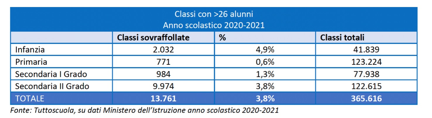 Il Rapporto rileva un aumento del numero di classi un po’ in tutte le regioni, un buon segnale per risolvere il fenomeno del sovraffollamento delle classicresciuto in modo esponenziale dall’introduzione del Dpr 81 del 2009, la cosiddetta Legge Tremonti-Gelmini”. Le “classi pollaio” vanno certamente in direzione opposta alla scuola di qualità, che favorisca l’apprendimento personalizzato, un ruolo attivo degli studenti, una forte motivazione e strumenti adeguati agli insegnanti. La riduzione della numerosità delle classi può favorire il distanziamento, la sicurezza dal punto di vista fisico e della salute, e condizioni favorevoli per la didattica e per l’apprendimento.
