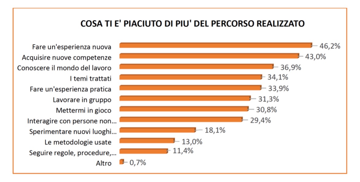 Poco più della metà degli studenti (51%) ritiene adeguata la quantità di ore dedicata ai Pcto e al percorso formativo, mentre il 18% afferma che siano poche e il 15% ritiene che siano eccessive. Circa il 40% ha sentito parlare della Carta dei diritti e dei doveri delle studentesse e degli studenti in alternanza scuola-lavoro, ma dichiara di non averla mai letta (40,7%), altri indicano di conoscerla (18,6%), un ulteriore 40% non la conosce affatto. Così pure oltre il 70% non conosce la piattaforma del ministero dell’Istruzione dedicata ai Pcto per far incontrare domanda/offerta, raccogliere feedback e criticità sui percorsi. Quanto al gradimento dei percorsi svolti, solo il 16% dice di “non essere soddisfatto del Pcto proposto”.