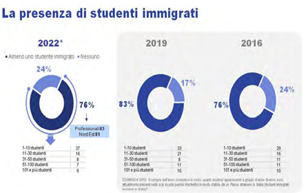 Per gli studenti immigrati sono previste attività mirate, con l’obiettivo di favorire l’inclusione e il decorso positivo dell’apprendimento (nel merito esistono leggi, circolari e linee guida del ministero dell’Istruzione). La principale è l’insegnamento della lingua italiana (62%), seguita dalla trattazione di tematiche legate alle migrazioni nell’ambito dell’educazione civica (56%). Le percentuali precipitano al 18% per la quota di scuole che dichiarano la presenza di mediatori culturali e linguistici, al 12% per le iniziative interne, anche ricreative, per promuovere la conoscenza tra le famiglie italiane e straniere e al 4% per le scuole che utilizzano il già citato metodo Clil nelle lingue prevalenti tra gli studenti stranieri.