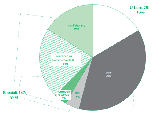 Composizione della produzione dei rifiuti in Italia Anno 2020, (milioni t, %). Fonte: Ispra, Catasto Nazionale Rifiuti