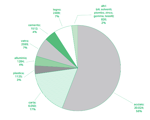 Impieghi di materie seconde nell’industria manifatturiera. Anno 2021 (migliaia ton, % su totale ricicli). Fonte: nostra stima su varie fonti. Include import netto, non include scarti interni