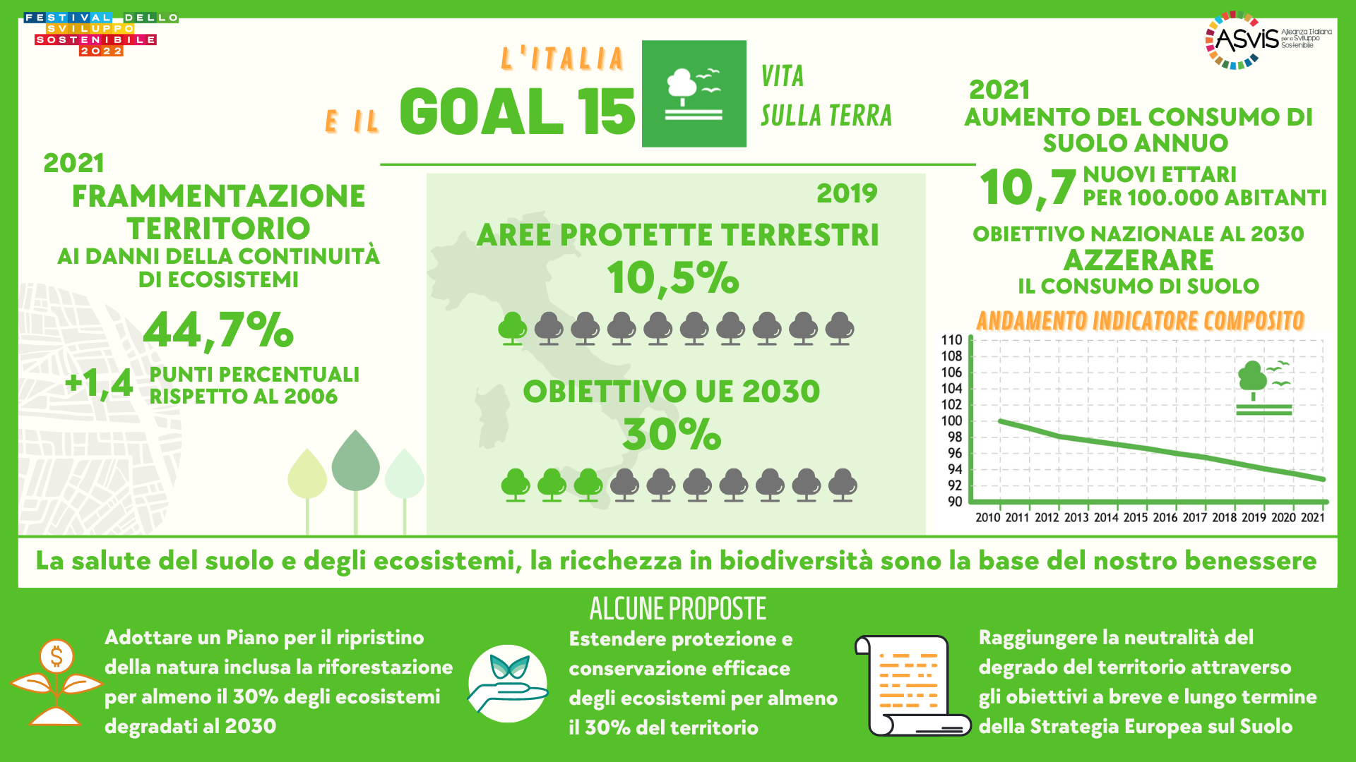 A livello italiano, l’indicatore composito sul Goal 15 peggiora tra il 2010 e il 2021, con un andamento costantemente negativo per l’intera serie storica analizzata. Le criticità di questo Goal riguardano il continuo aumento del consumo di suolo. In particolare, tra il 2006 e il 2021, l’impermeabilizzazione del suolo passa dal 6,7% al 7,1% (+1.153 chilometri quadrati di suolo consumato) e la frammentazione del territorio naturale e agricolo passa da 44,5% nel 2012 a 44,7% nel 2021. Il coefficiente di boscosità è l’unico indicatore che evidenzia segni di miglioramento, passando da 35,7% nel 2010 a 37,8% nel 2020. Solo nel 2020 si è assistito a una diminuzione dell’incremento del consumo di suolo, dovuto principalmente alla riduzione delle attività economiche causata dalla crisi pandemica.