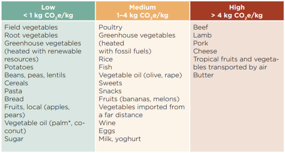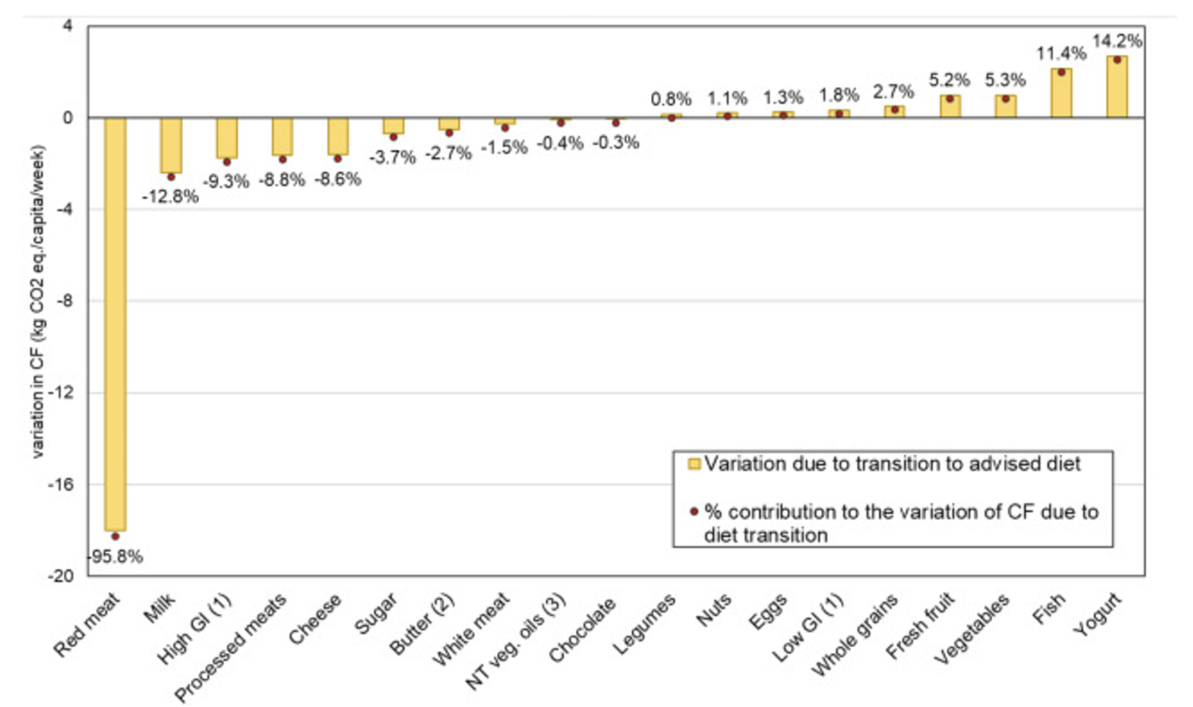 La dieta europea. Fatta eccezione per il pesce e lo yogurt, il cui consumo attuale è inferiore a quello auspicabile, le popolazioni europee utilizzano quantità maggiori di tutti gli alimenti di origine animale rispetto alle dosi consigliabili, soprattutto carni rosse e lavorate, latte e formaggi. Al contrario, le quantità di quasi tutti gli alimenti a base vegetale (cioè cereali integrali, frutta, verdura, noci e legumi) sono inferiori a quelle consigliate. Nell'attuale modello di consumo alimentare, la combinazione di carne rossa, latte e formaggio rappresenta circa il 70% dell’impronta di carbonio settimanale. In particolare, la carne rossa, con un apporto settimanale di circa 800g pro capite, rappresenta la stragrande maggioranza dell’impronta. Riducendo i consumi di carne rossa, latte e cereali raffinati ad alto indice glicemico, l’impronta di carbonio verrebbe drasticamente ridotta.