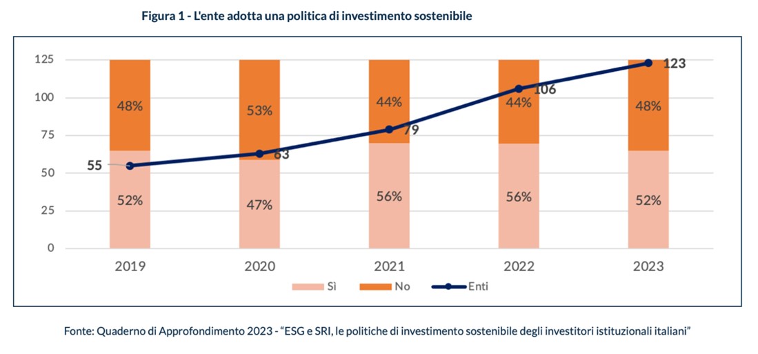 Gli investitori e la porzione di patrimonio investito. Il 52% degli investitori italiani dichiara di adottare già politiche di investimento sostenibile, scegliendo la finanza Sri (Sustainable and responsible investment, ovvero legata a investimenti responsabili e sostenibili). L’80% di quanti ancora non l’hanno già adottata, hanno comunque già affrontato la proposta in Consiglio di Amministrazione; numerosi anche gli investitori che hanno già acquistato prodotti Esg, ma non hanno ancora formalmente aderito alla finanza Sri. Inoltre, la percentuale di enti che, dopo averne discusso in CdA, decide di non approcciare la finanza Sri è passata dal 15% di 3 anni fa allo 0 del 2023.