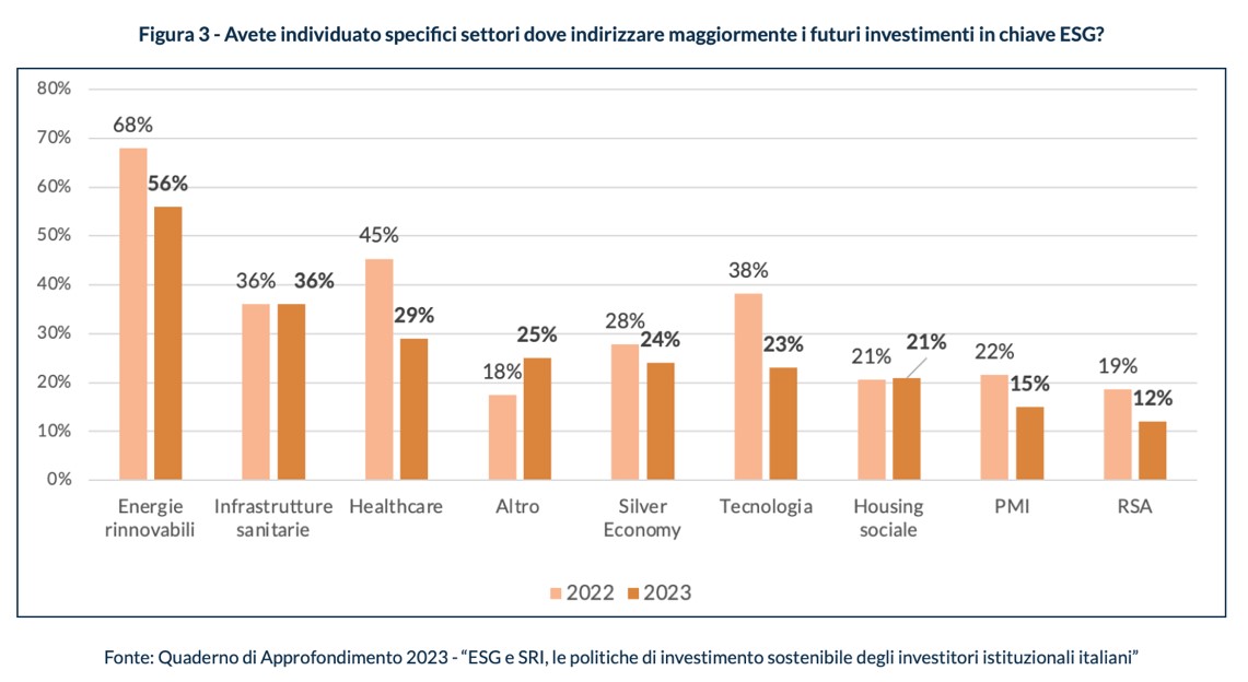Il 51% dei rispondenti afferma di voler incrementare l’investimento in strumenti sostenibili: le energie rinnovabili (56%), le infrastrutture sanitarie (36%) e l’healthcare (29%) sono indicati tra i settori più interessanti; seguono tecnologia e Silver economy, ambito comunque destinato a una forte crescita in considerazione della portata del fenomeno di invecchiamento della popolazione.