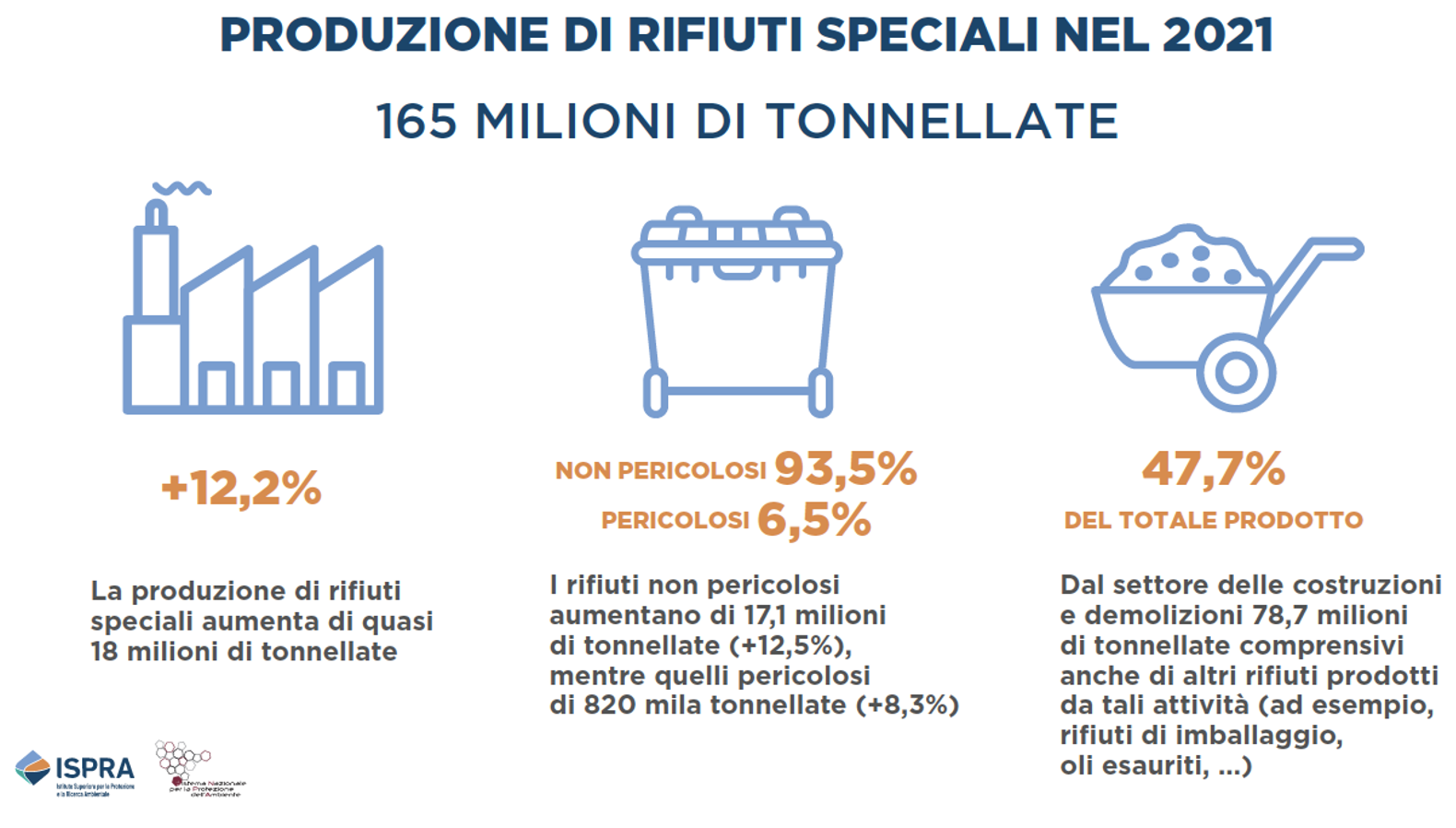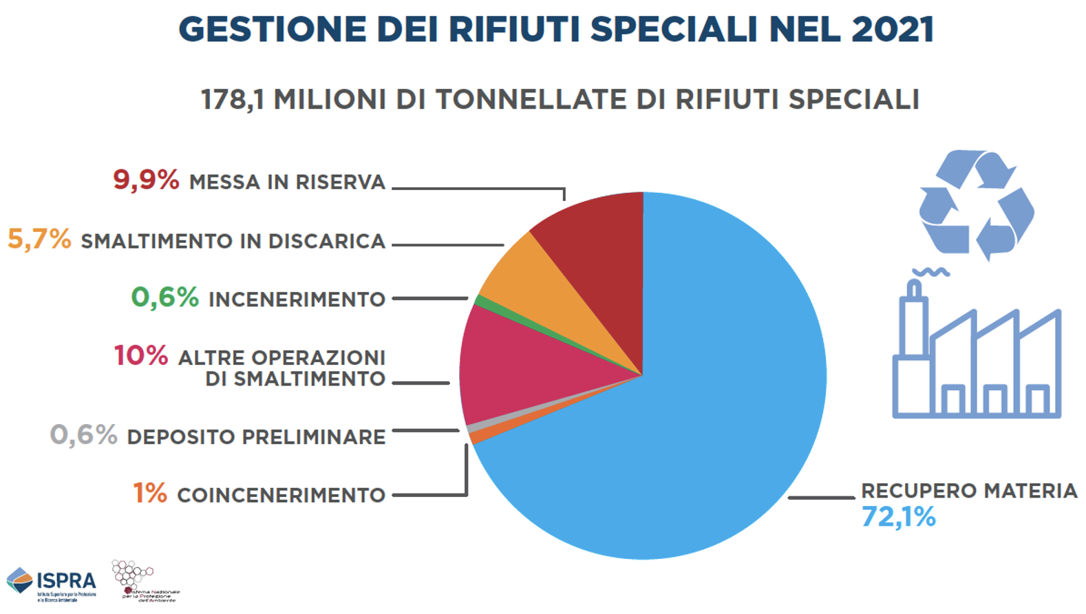 Nel 2021 sono stati gestiti 178,1 milioni di tonnellate di rifiuti speciali, con un aumento del 12,2% rispetto al 2020, corrispondente a circa 18 milioni di tonnellate.