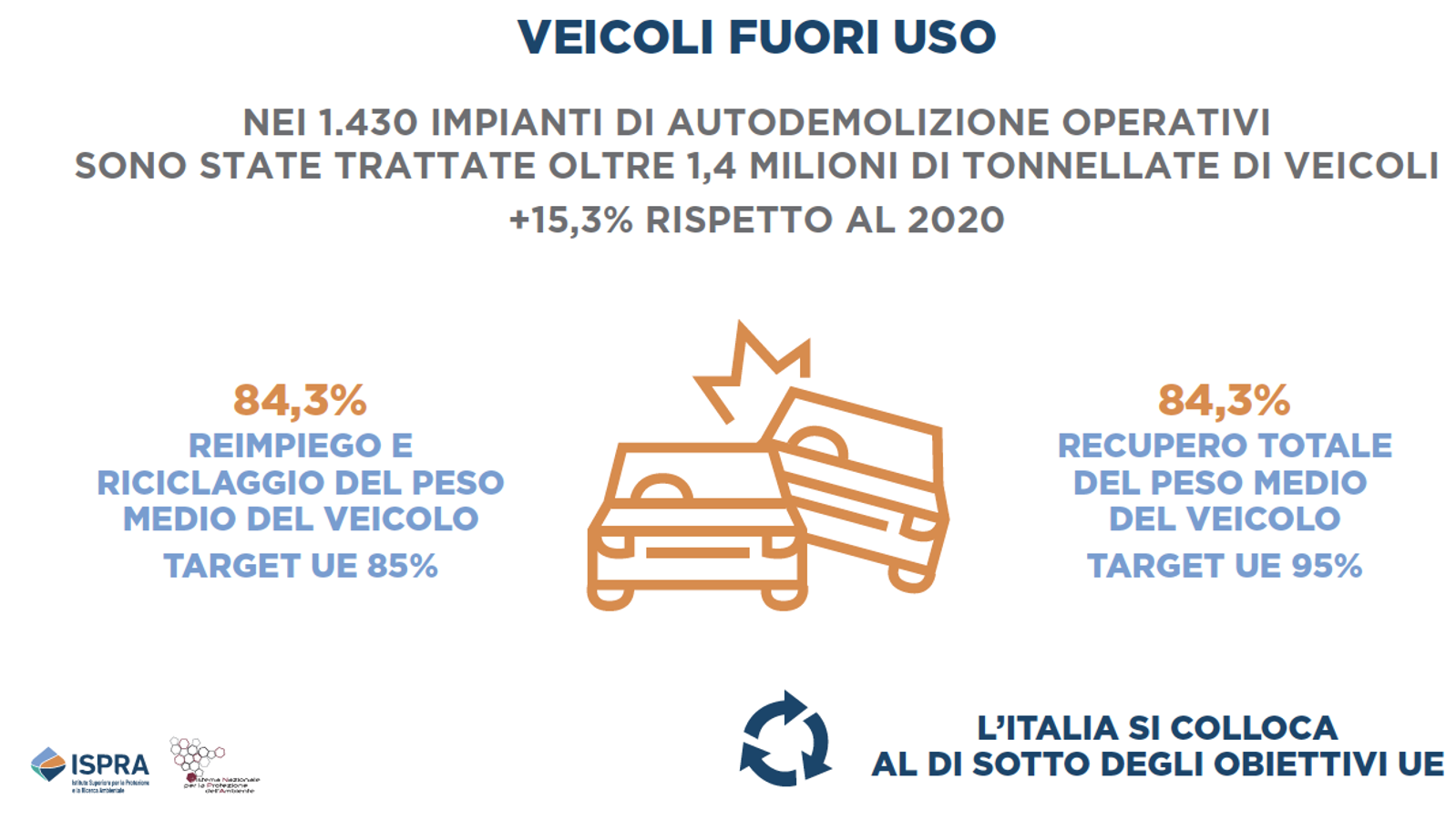 2) veicoli fuori uso: la gestione dei veicoli fuori uso ha raggiunto oggi una percentuale di reimpiego e riciclaggio pari all'84,3% del peso medio del veicolo, lontana ancora dall'obiettivo del recupero totale fissato al 95% dalla normativa vigente;