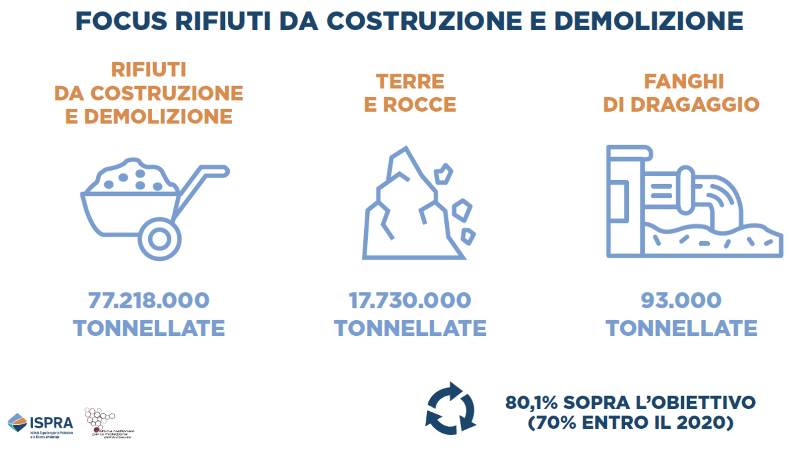 5) rifiuti da operazioni di costruzione e demolizione: il settore delle costruzioni e demolizioni genera il flusso più rilevante di rifiuti speciali, rappresentando il 47,7% del totale prodotto. Nel 2021 sono stati prodotti 78,7 milioni di tonnellate di rifiuti da operazioni di costruzione e demolizione. L'obiettivo europeo del 70% di preparazione per il riutilizzo, riciclaggio e altri tipi di recupero di materiale è stato superato, con una percentuale di recupero pari all'80,1%. La principale forma di recupero per i rifiuti da costruzione e demolizione è la trasformazione in inerti per la produzione di calcestruzzo o asfalto;