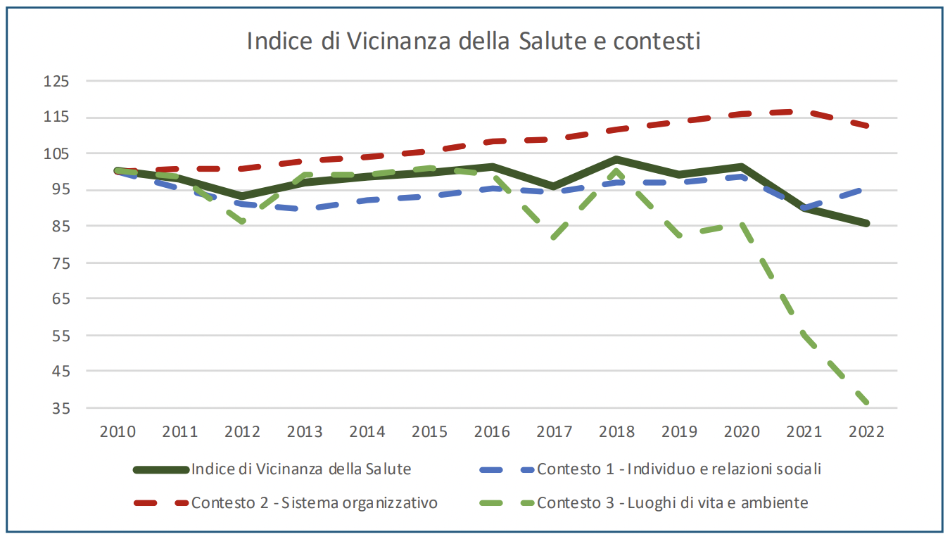 Nel primo contesto, relativo alla sfera individuale e le relazioni sociali, spiccano l’isolamento, i bassi livelli di coesione sociale, l’aumento dei sintomi di depressione e la fragilità economica. Il secondo contesto, che prende in esame l’apparato organizzativo del sistema salute, incide sul peggioramento generale con la carenza del personale sanitario, dei servizi e delle prestazioni sul territorio, portando i cittadini a rinunciare alle cure o al trasferimento verso altre Regioni per soddisfare i propri bisogni di salute. Nel terzo contesto, dedicato all’impatto dei luoghi di vita e fattori ambientali, predominano l’intensificarsi degli eventi estremi meteoclimatici e l’inquinamento atmosferico nelle città, da cui la diffusione nella popolazione di un malessere generalizzato definito “ecoansia”.