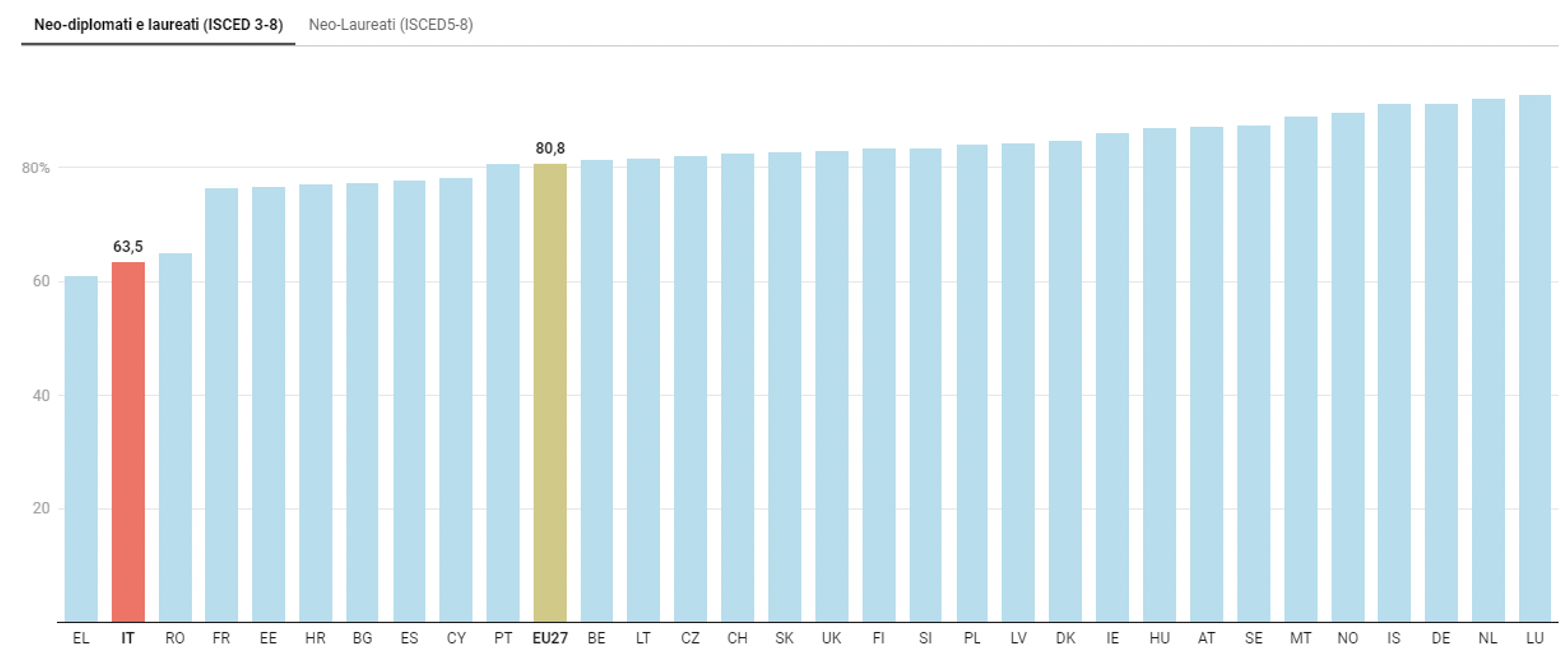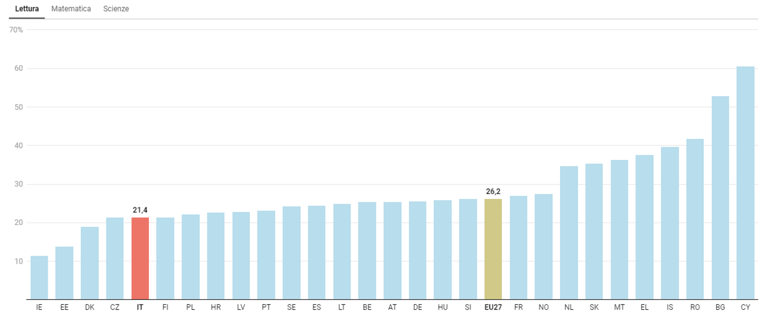 L’immagine di “inverno demografico” restituisce solo in parte le dinamiche involutive della popolazione italiana. Il numero dei giovani continua a calare e gli studi indicano che nel 2030, al netto dei flussi migratori, i giovani tra i 20 e i 34 anni saranno 580mila in meno rispetto ad oggi. Più che inverno, evidenzia il Rapporto, siamo davanti ad una “glaciazione demografica”. Oggi più che mai, la qualità e la coerenza dei percorsi educativi e formativi possono fare la differenza nell’affrontare con maggiore fiducia le sfide della crescita e della fioritura personale, a livello professionale, sociale, economico, culturale, civico, politico. Ma, continua il Rapporto, l’Italia è in ritardo nel confronto con i principali Paesi europei. Il mancato raggiungimento degli standard attesi in lettura, matematica e scienze coinvolge una “quota inaccettabile” di 15enni italiani. L’Italia si colloca al penultimo posto per numero di giovani di età compresa tra i 25 e i 34 anni che hanno conseguito almeno un titolo di studio terziario (dalla Laurea triennale o altri titoli equipollenti in poi). Non va meglio nell’area del digitale. Tra i giovani italiani tra i 16 e i 29 anni poco meno di un terzo raggiunge un livello di competenze digitali superiori a quelle di base.