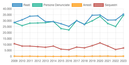 Sale, in maniera ancora più significativa, il numero di persone denunciate per questi reati: 34.481 provvedimenti giudiziari, un aumento del 30,6% in un anno. Anche gli arresti sono in forte crescita, passando da 193 nel 2022 a 319 nel 2023 (+43%).