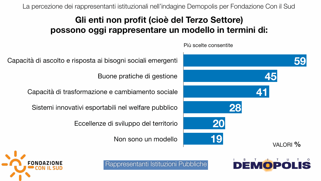 Le istituzioni pubbliche riconoscono al Terzo settore tre principali meriti: la capacità di ascolto e risposta (59%), le buone pratiche di gestione (45%) e la spinta al cambiamento sociale (41%). C’è anche chi guarda al non profit come a un laboratorio da cui prendere esempio: per il 28% degli intervistati, le esperienze maturate nel Terzo settore dovrebbero ispirare anche il welfare pubblico.