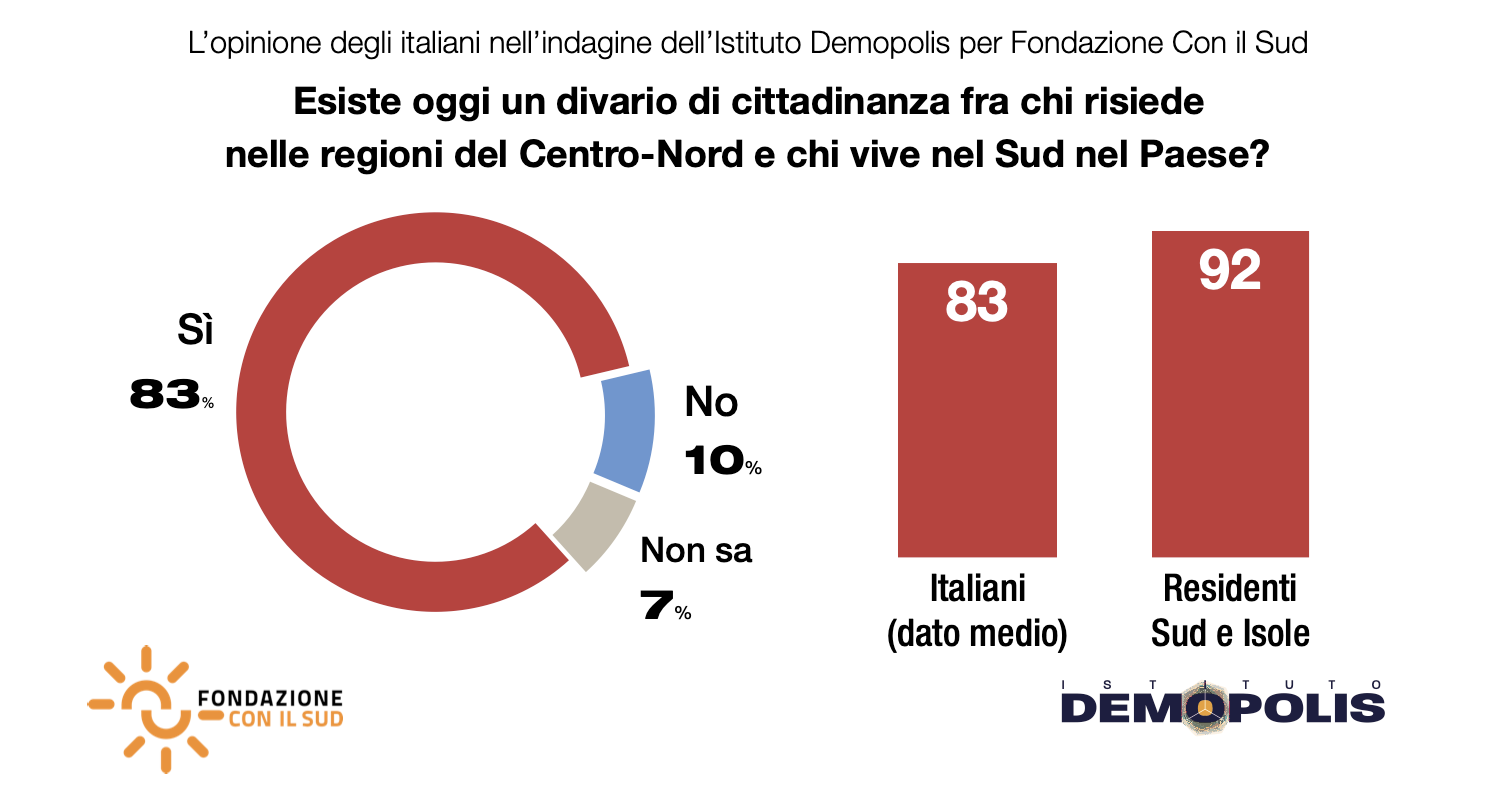 Secondo il sondaggio, per oltre l’80% degli italiani il ritardo del Mezzogiorno frena lo sviluppo dell’intero Paese, mentre il 92% delle cittadine e dei cittadini meridionali parla apertamente di un vero e proprio “divario di cittadinanza” rispetto al Centro-Nord.