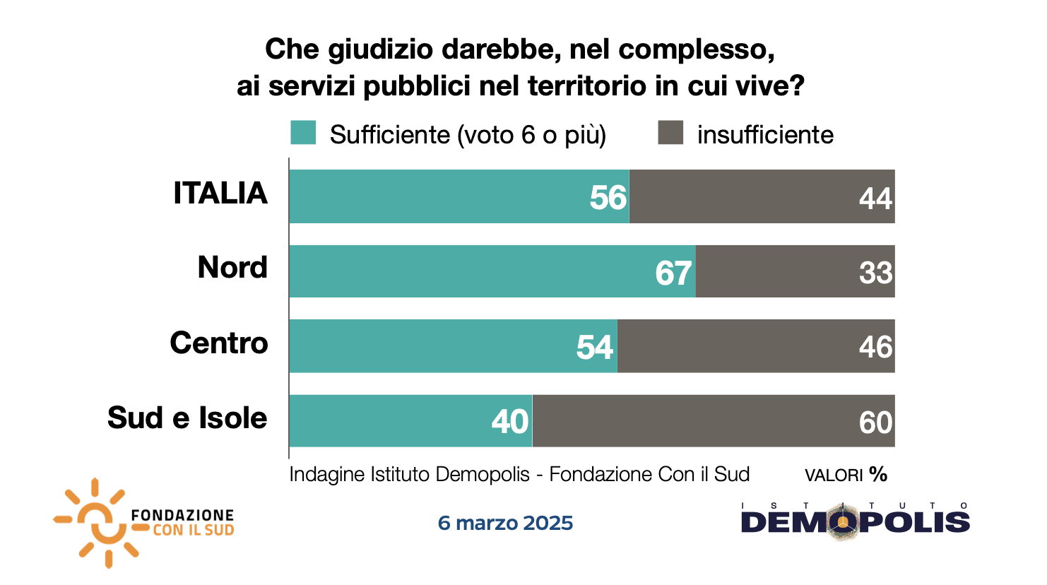 A questo si somma un divario crescente nella qualità della vita. La soddisfazione per i servizi pubblici, in una sorta di “pagella” nazionale, vede il Nord con il 67% di giudizi positivi, il Centro al 54% e il Sud fanalino di coda con appena il 40%. Non si tratta solo di percezioni: dietro ci sono ospedali meno accessibili, trasporti carenti, scuole con meno risorse. Il 75% degli italiani ritiene che non sia possibile generare sviluppo economico senza prima affrontare le emergenze sociali.