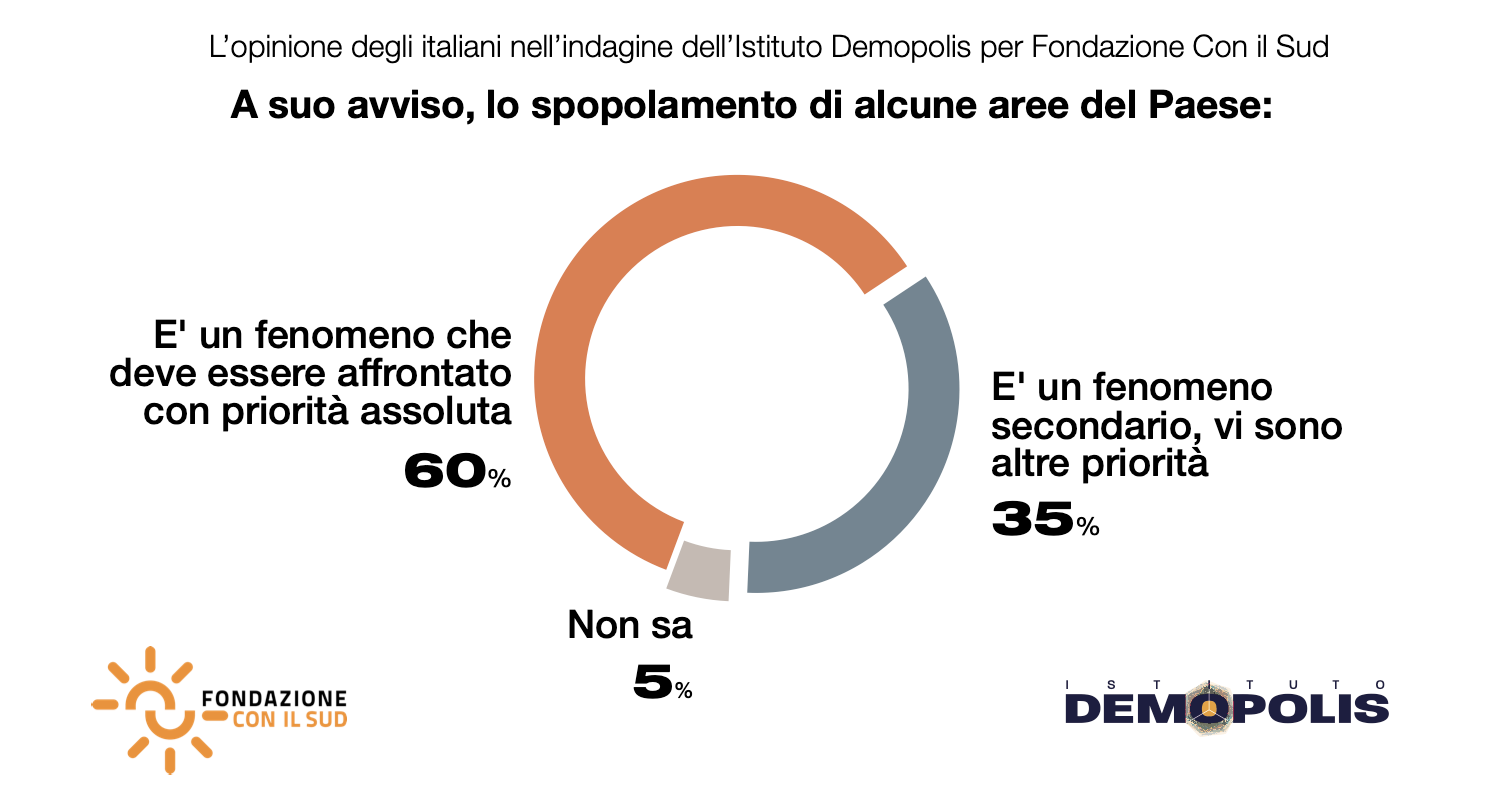 Il primo allarme è demografico: 6 italiani su 10 (e quasi 7 su 10 al Sud) ritengono che oggi lo spopolamento sia un’emergenza da affrontare con la massima priorità. Preoccupa soprattutto il fenomeno nelle aree interne, dove il calo di popolazione si accompagna alla riduzione dei servizi essenziali.