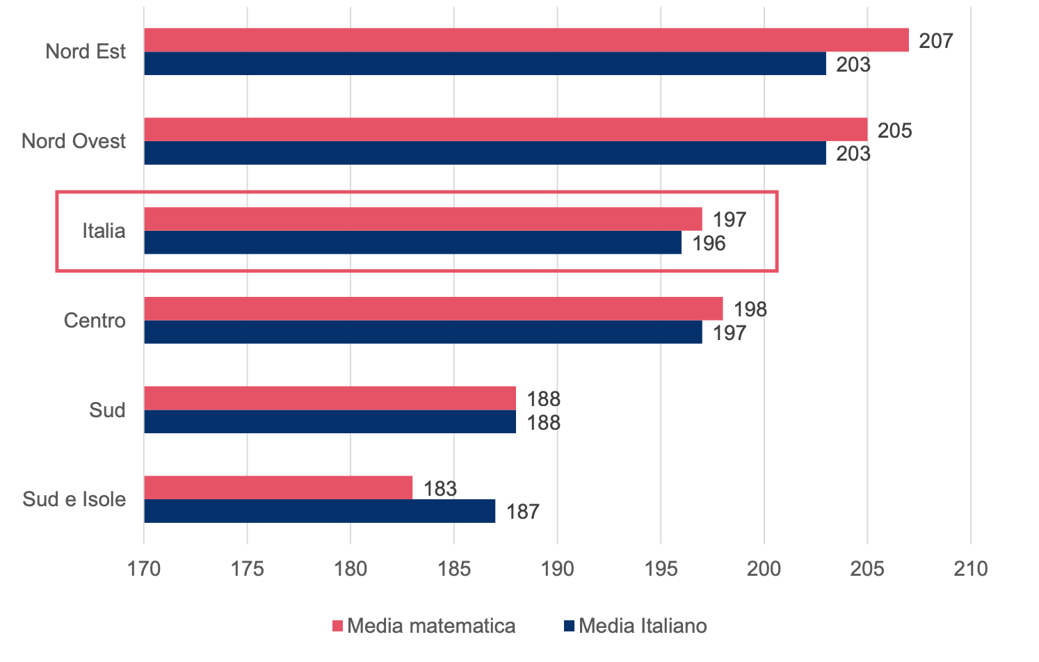 I risultati confermano che i divari di apprendimento nel nostro Paese sono legati ad una molteplicità di fattori che si intrecciano fra loro. È noto che i divari territoriali di apprendimento seguono in prevalenza il gradiente Nord-Sud. Ad esempio, se consideriamo la matematica, la distanza fra la macroarea con i risultati migliori (Nord Est: Veneto, Trentino Alto Adige, Friuli Venezia-Giulia ed Emilia-Romagna) e quella con i risultati peggiori (Sud e isole: Basilicata, Calabria, Sicilia, Sardegna) è di 24 punti. Questo significa che in matematica gli studenti di Sud e Isole sono indietro di oltre due anni nell’apprendimen to. Limitarsi ai divari territoriali, sottolinea perù l’indagine, non permette di cogliere la complessità del fenomeno. I gap scolastici possono avere altre cause, come ad esempio la condizione socio-economica, le caratteristiche degli studenti, le differenze tra le classi e quelle fra le scuole.