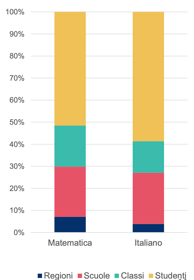 In Italia, la varianza (le differenze) nei punteggi Invalsi nella classe seconda della scuola secondaria di II grado è distribuita, ad esempio, in matematica: per il 52% è data da differenze nelle caratteristiche degli studenti, per il 19% da differenze tra classi, per il 23% tra scuole e per il 7% tra regioni (indice economico-culturale)