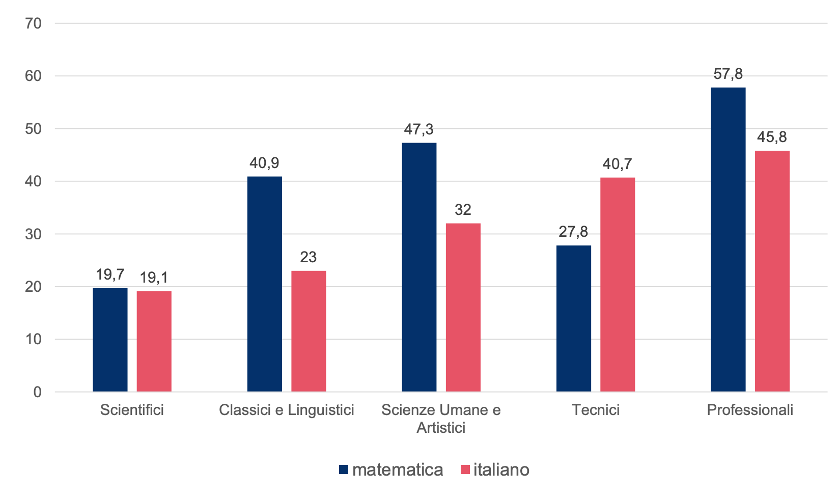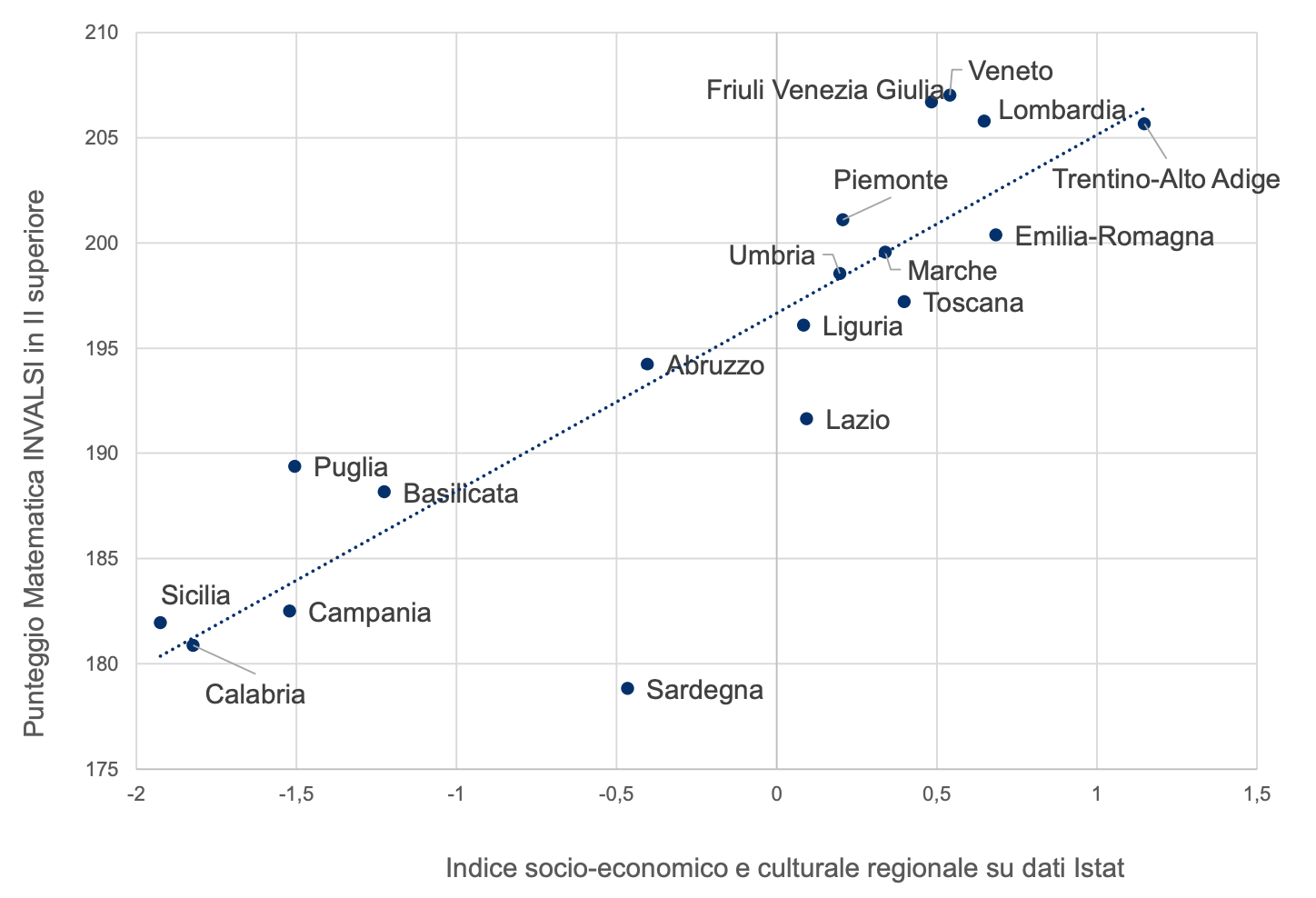 Eppure, evidenzia l’indagine, dall’analisi emergono casi di “disallineamento”, cioè di regioni che pur con un indice di contesto socioeconomico e culturale simile ad altre, hanno risultati Invalsi decisamente più alti, come ad esempio Puglia vs Campania e Sardegna vs Abruzzo, Lazio vs le altre regioni del Centro in matematica.