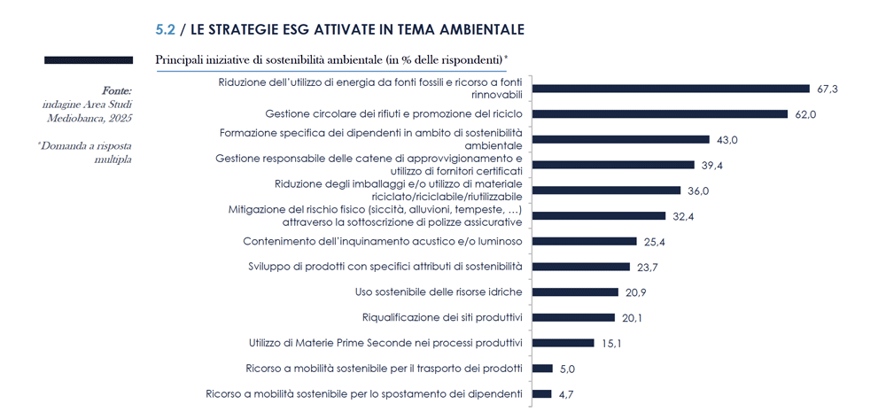 Oltre otto medie imprese italiane su dieci hanno già avviato iniziative Esg, soprattutto in ambito ambientale, con azioni concrete per ridurre l’uso di fonti fossili, migliorare la gestione dei rifiuti e formare i dipendenti sulla sostenibilità. La misurazione delle emissioni di gas resta però una sfida aperta: il 62,3% delle imprese non è in grado di misurarle e solo il 40,9% ritiene realistico raggiungere la neutralità climatica entro il 2050. Un dato che mostra la distanza tra buone intenzioni e strategia strutturata. È quanto emerge dal rapporto “Scenario competitivo, Esg e innovazione strategica per la creazione di valore nelle medie imprese industriali italiane”, realizzato dall’Area Studi Mediobanca, dal Centro Studi Tagliacarne e da Unioncamere, che accompagna la XXIV edizione dell’indagine annuale sulle medie imprese industriali.