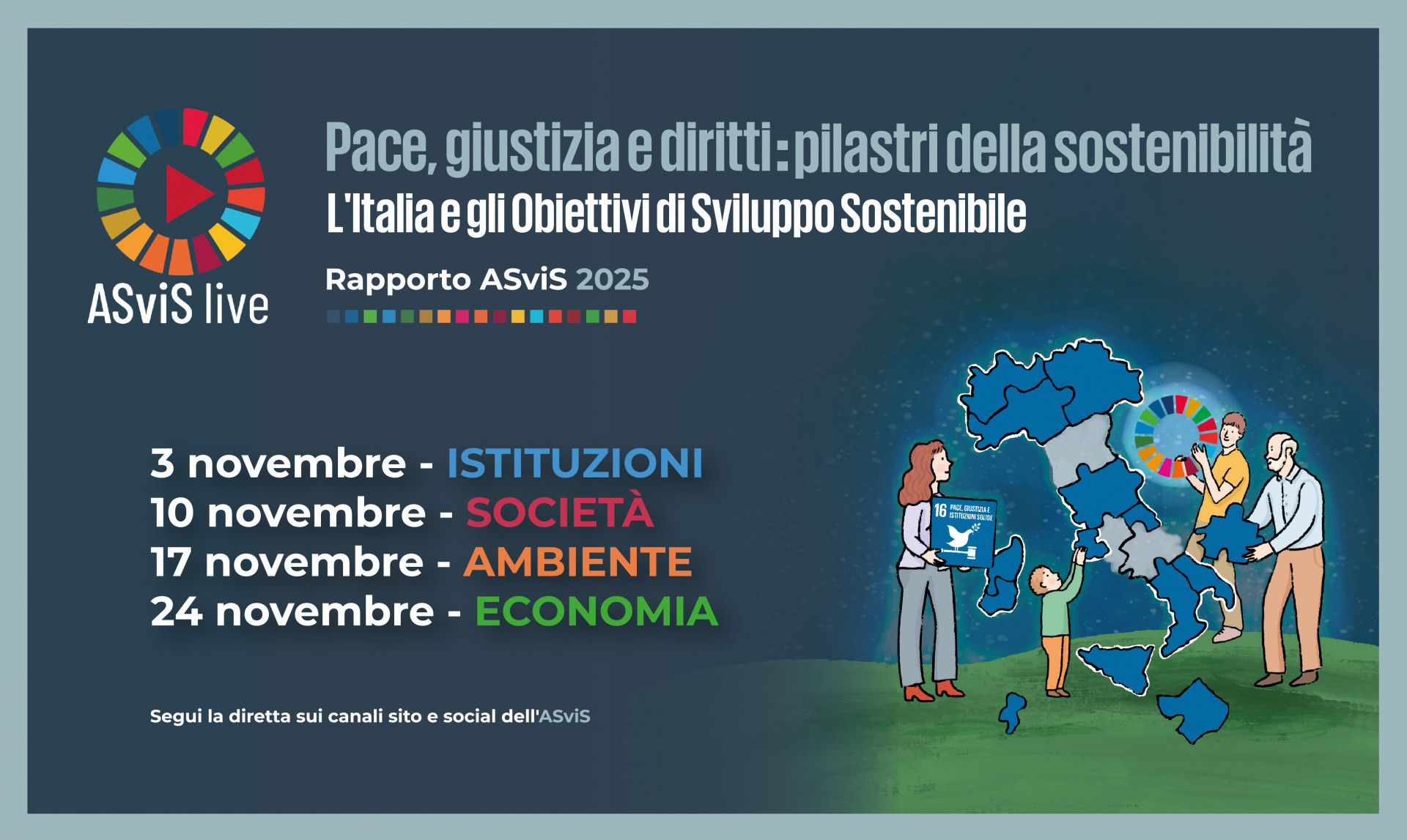 Per approfondire i contenuti del Rapporto 2025 "Pace, giustizia e diritti: pilastri della sostenibilità", l'Alleanza organizza quattro eventi, gli "ASviS Live", focalizzati su ciascuna delle quattro dimensioni dello sviluppo sostenibile – istituzionale, sociale, ambientale ed economica –, in cui rappresentanti delle istituzioni e stakeholder chiave si confronteranno sulle numerose analisi e proposte presentate nel documento.