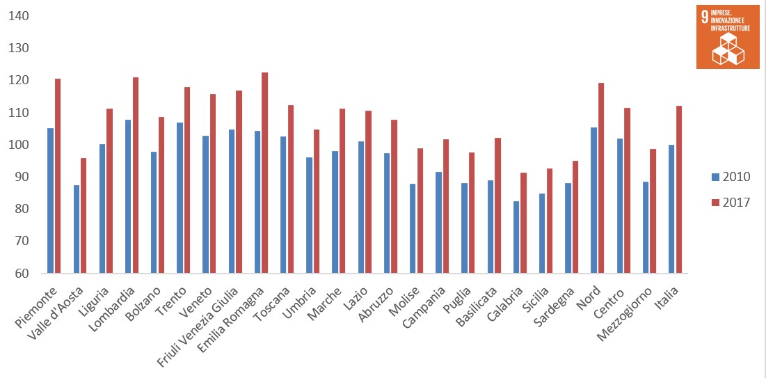 Il Rapporto ASviS 2019 evidenzia un continuo miglioramento per quanto riguarda il Goal 9 in Italia, dovuto a un aumento degli indicatori relativi alla diffusione della banda larga, all’utilizzo di internet, al tasso di ricercatori e alla quota di merci trasportate su ferrovia. A livello regionale, sebbene il miglioramento del Goal interessi tutte le regioni italiane, il Mezzogiorno continua a registrare un’ampia distanza dalla media italiana. Le regioni che migliorano maggiormente tra il 2010 e il 2017 e che raggiungono i valori più elevati sono il Piemonte e l’Emilia-Romagna.