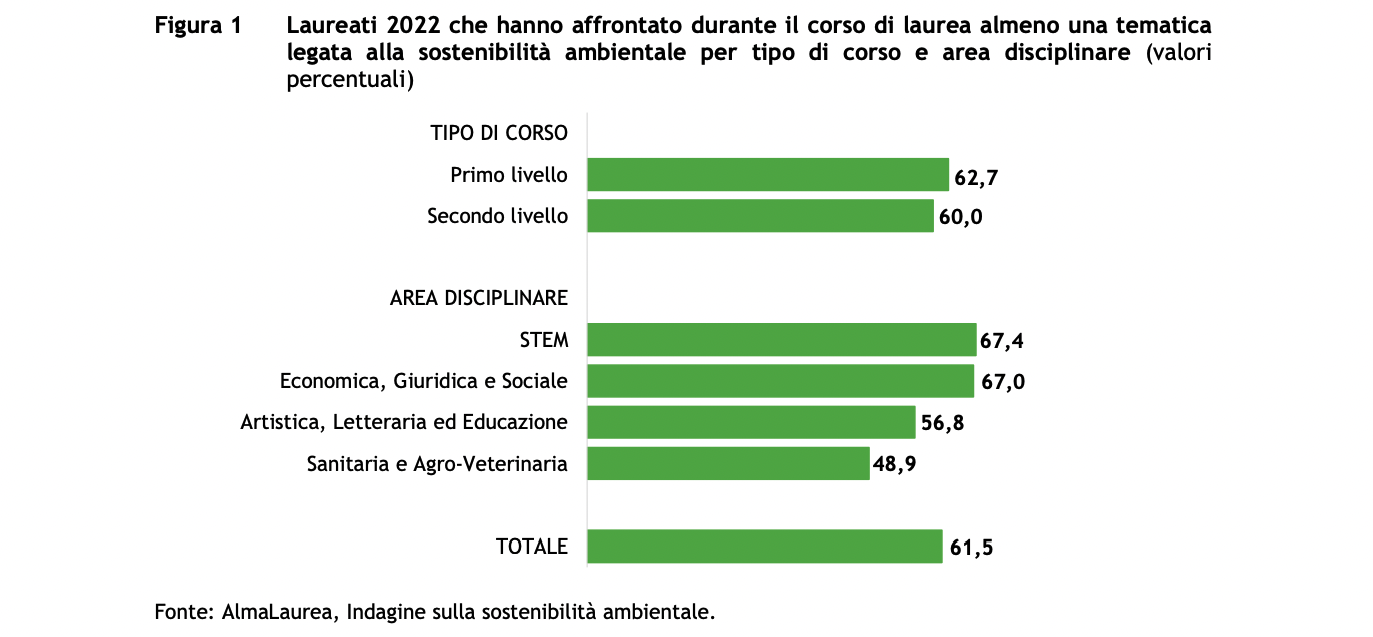 Su un campione di quasi 222mila laureati che hanno partecipato all’indagine e che rappresentano quasi l’80% di tutti quelli usciti dalle università nel 2022, sono poco più del 60% i laureati che dichiarano di aver affrontato durante il corso di laurea almeno una tematica legata alla sostenibilità ambientale, mentre a livello di area disciplinare sono i laureati nelle materie Stem (scienza, tecnologia, ingegneria e matematica) e quelli dell’area economica, giuridica e sociale a detenere il primato rispettivamente con il 67,4% e il 67%; più distanti i laureati dell’area artistica, letteraria ed educazione (56,8%) e quelli dell’area sanitaria e agro-veterinaria (48,9%, Figura 1).