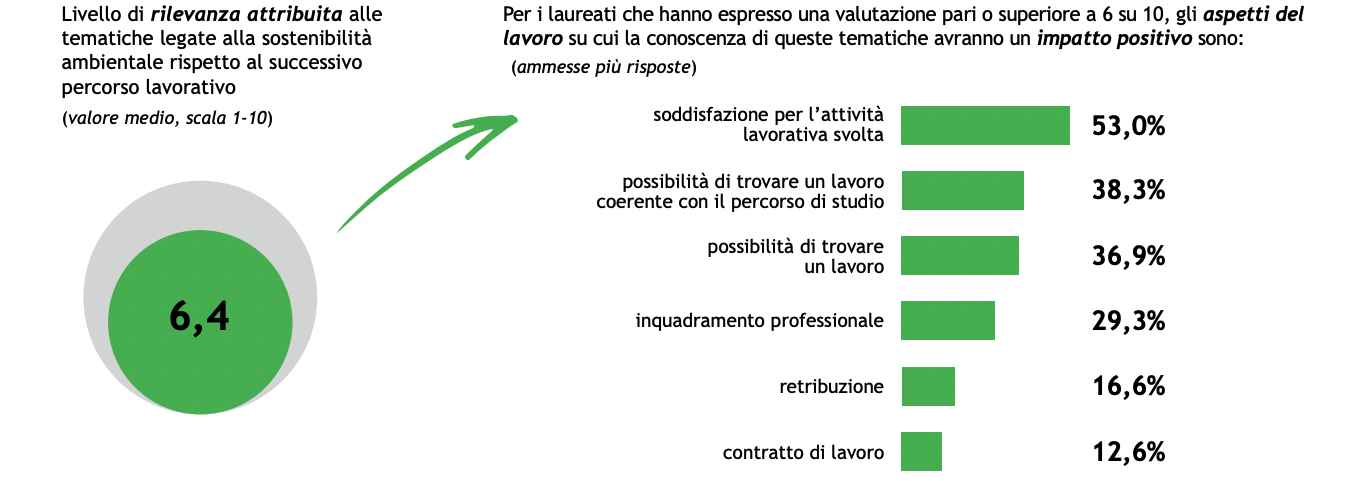 Infine, è rilevante osservare che, tra i laureati, più della metà ritiene che la conoscenza delle tematiche legate alla sostenibilità ambientale avrà un impatto positivo sul futuro percorso lavorativo e sulla soddisfazione per l’attività svolta.