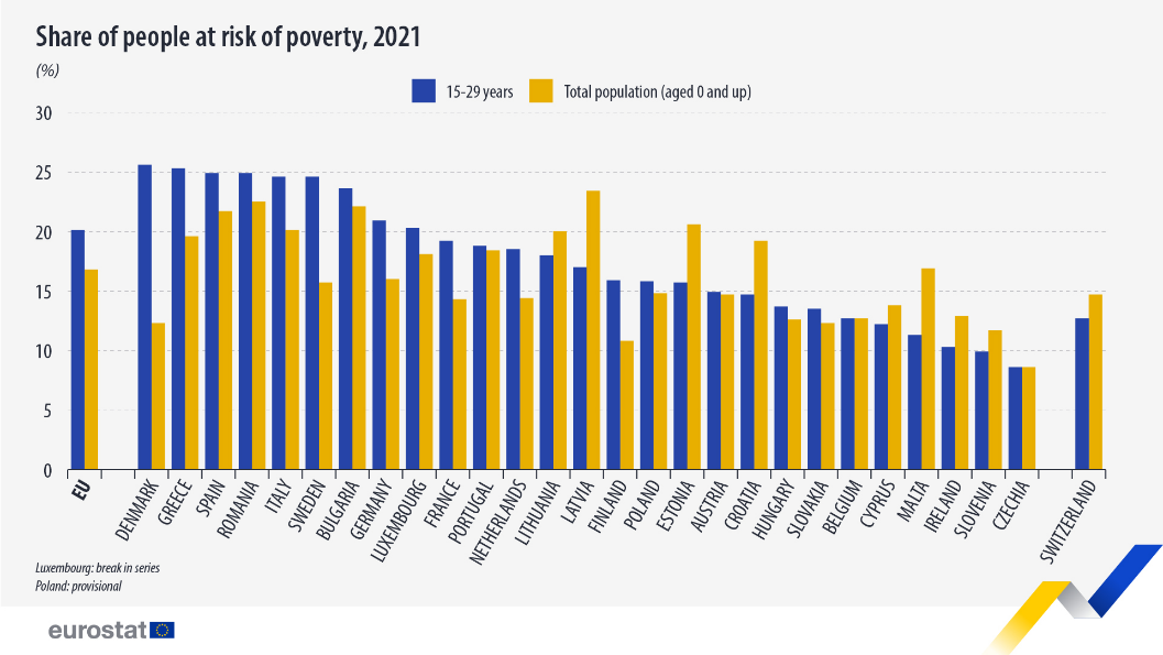 Un aspetto da considerare per valutare la diffusione degli alloggi coliving è la povertà giovanile. Nel 2021, nei Paesi dell’Unione europea, il 20% dei giovani tra i 15 e i 29 anni era a rischio povertà, contro una media nella popolazione pari al 16,9%. In Italia il dato è ancora più allarmante perché a essere a rischio è un giovane su quattro.