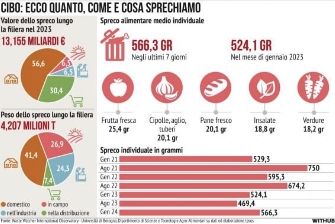 Ogni cittadino italiano, secondo le stime, sprecherà quotidianamente circa 80,9 grammi di cibo, arrivando a 566,3 grammi a settimana, con un incremento di 42,2 grammi rispetto al 2023. 4 tonnellate di cibo sprecate per un valore di 13 miliardi (quasi l'1% del Pil), di cui 7,5 miliardi derivanti dalle abitazioni, quasi quattro dalla distribuzione e il restante, molto più contenuto, in campo e nell’industria.